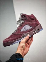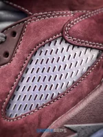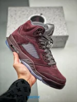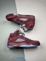 The 2023 edition of the Air Jordan 5 Retro SE ‘Burgundy’ brings back a 2006 colorway from Jordan Brand’s Lifestyle Series. The legacy silhouette utilizes a burgundy suede upper, accented with contrast stitching and breathable translucent netting on the quarter panel. Embroidered Jumpman branding decorates the heel overlay and tongue, treated with a sliver reflective finish for added visibility during low-light conditions. A color-matched polyurethane features speckled shark-tooth detailing and a visible Air-sole unit nestled in the heel. Underfoot, a translucent herringbone-traction outsole delivers reliable grip.