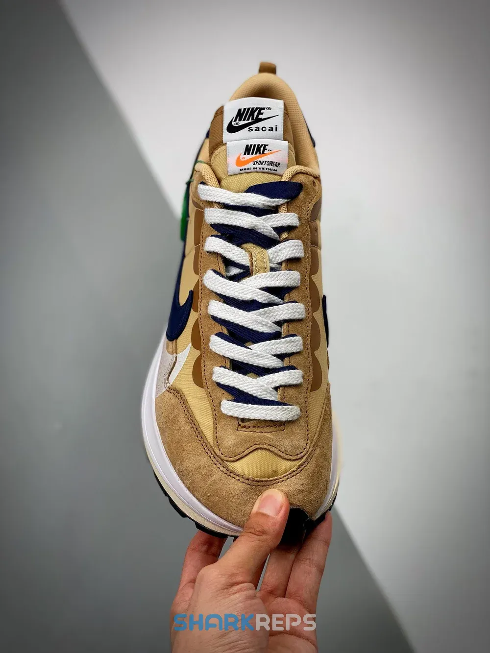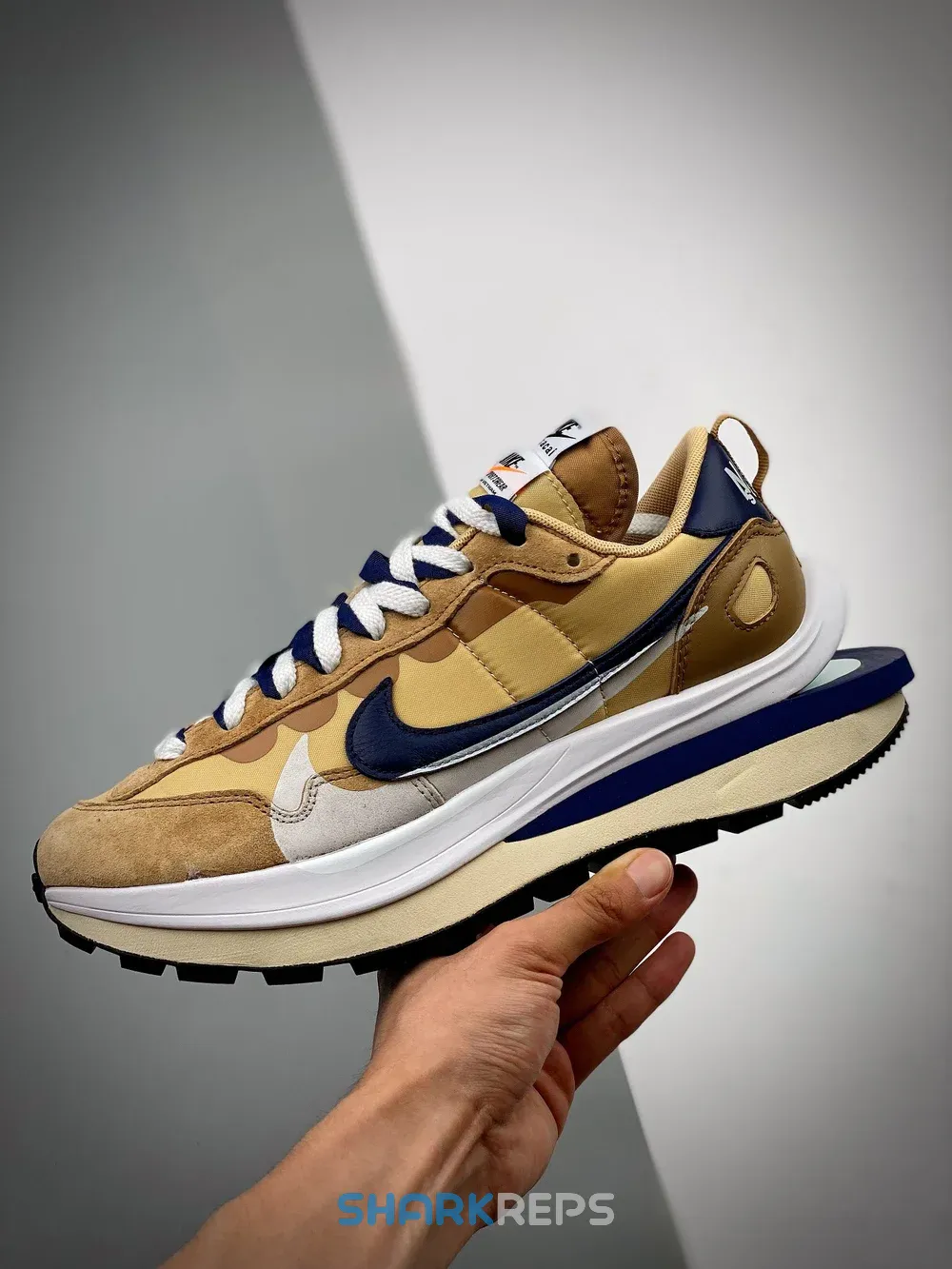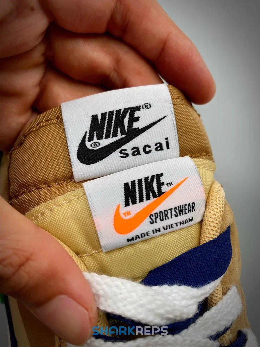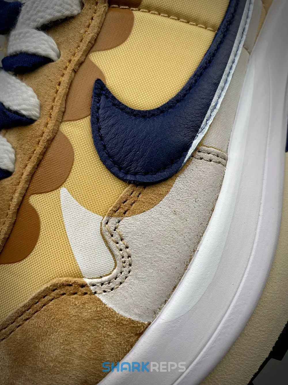 The sacai x Nike VaporWaffle ‘Sesame Blue Void’ reunites the Swoosh with the Tokyo-based fashion label helmed by Chitose Abe. Blending elements from the modern Vaporfly and vintage Pegasus runner from 1983, the hybrid silhouette makes use of a khaki textile upper with tonal leather and suede overlays. A blue leather Swoosh is joined by a larger printed Swoosh in contrasting white. Tongues are similarly doubled up, each accented with a woven Nike tag. The sneaker rides on a dual-layered foam midsole, featuring split heel detailing and supported by a classic waffle tread outsole.