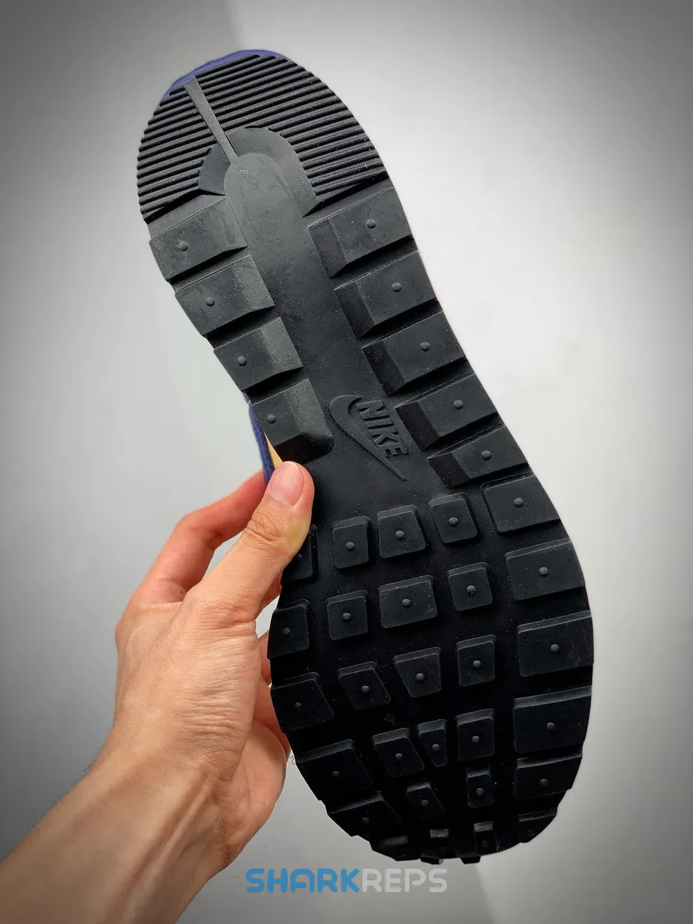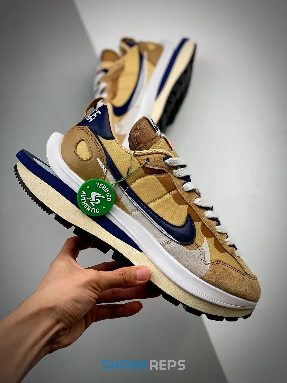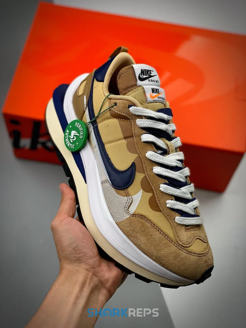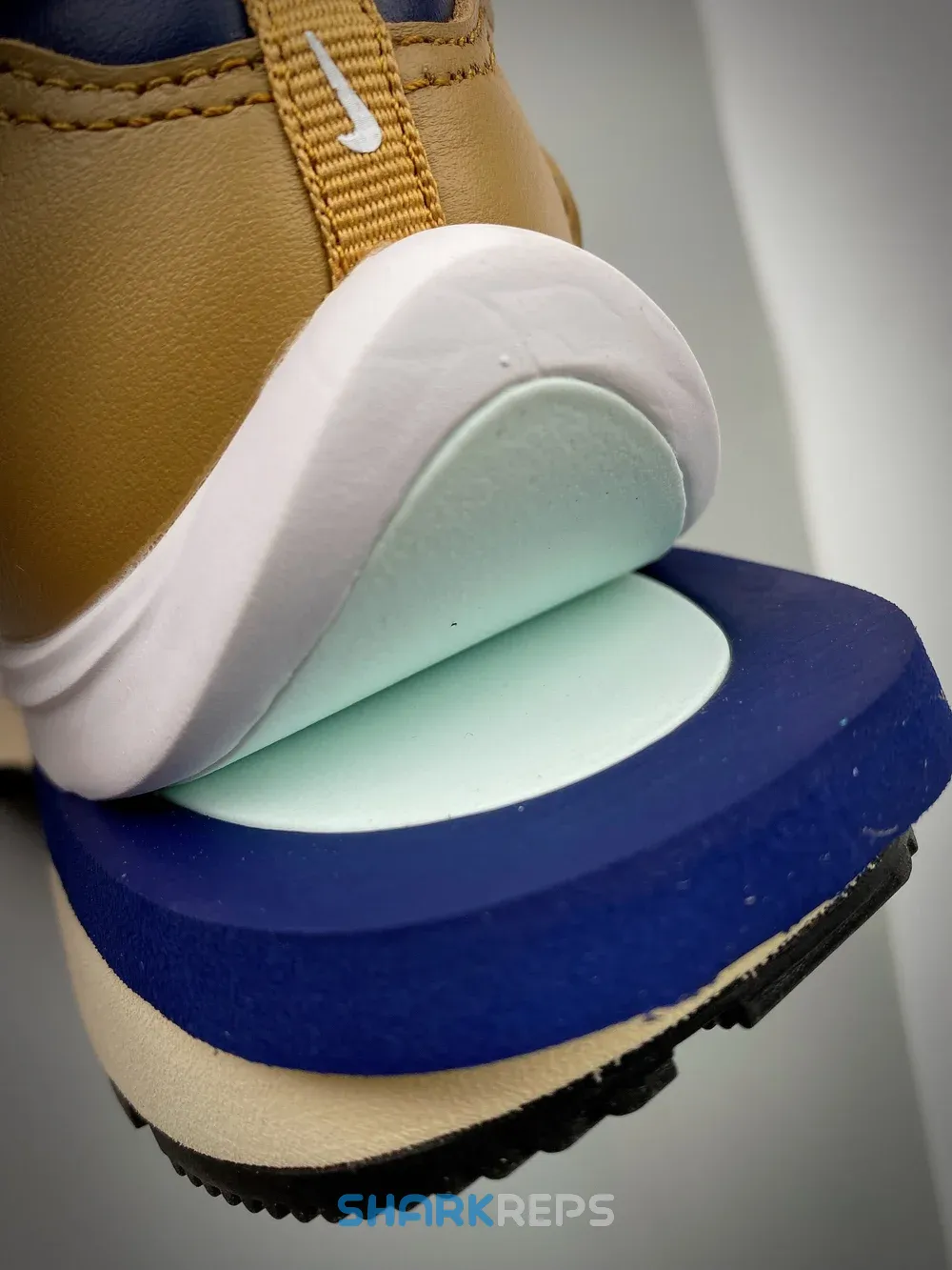The sacai x Nike VaporWaffle ‘Sesame Blue Void’ reunites the Swoosh with the Tokyo-based fashion label helmed by Chitose Abe. Blending elements from the modern Vaporfly and vintage Pegasus runner from 1983, the hybrid silhouette makes use of a khaki textile upper with tonal leather and suede overlays. A blue leather Swoosh is joined by a larger printed Swoosh in contrasting white. Tongues are similarly doubled up, each accented with a woven Nike tag. The sneaker rides on a dual-layered foam midsole, featuring split heel detailing and supported by a classic waffle tread outsole.