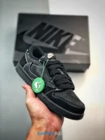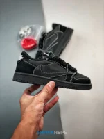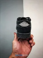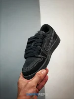 Offered in little kid sizing, the Travis Scott x Air Jordan 1 Retro Low OG SP PS ‘Black Phantom’ combines a sleek finish with La Flame’s signature touches. The low-top sports an all-black nubuck and suede upper with contrast white stitching throughout. Scott’s backward Swoosh decorates the lateral side, while woven Nike tags embellish each tongue. Mismatched heel tabs display a Jordan Wings logo on the right shoe and a bee graphic on the left. Anchoring the sneaker is a black rubber cupsole with stitched sidewall construction.