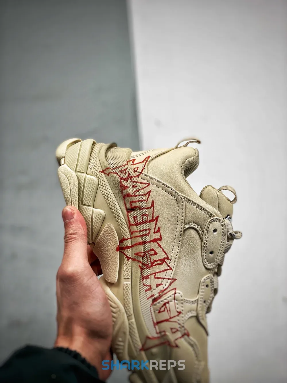 Featuring a triple-stacked sole, the Triple S delivers bold proportions and maximum comfort. The upper blends mesh, leather, and synthetic materials for a layered, deconstructed look, while subtle distressing gives it a vintage vibe. Embroidered size detailing on the toe and Balenciaga branding on the side complete the signature design.