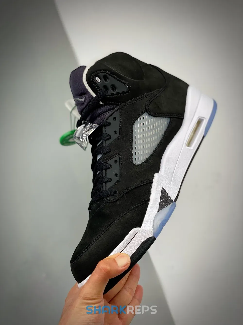 The 2021 edition of the Air Jordan 5 Retro ‘Oreo’ 2021 brings back a simple two-tone colorway first released in 2013. The build is faithful to the original, featuring a black suede upper with tonal TPU eyelets, translucent quarter panel netting and a grey Jumpman embroidered on the tongue. Contrasting white hits appear on the collar lining, interior tongue and Jumpman heel branding. The mid-top sits on a white polyurethane midsole with a visible Air unit nestled in the heel and black shark-tooth detailing dusted in white speckles. Underfoot, an icy rubber outsole delivers stop-and-go traction.