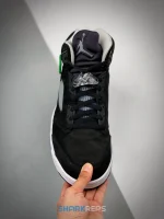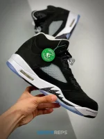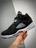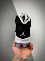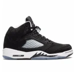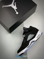 The 2021 edition of the Air Jordan 5 Retro ‘Oreo’ 2021 brings back a simple two-tone colorway first released in 2013. The build is faithful to the original, featuring a black suede upper with tonal TPU eyelets, translucent quarter panel netting and a grey Jumpman embroidered on the tongue. Contrasting white hits appear on the collar lining, interior tongue and Jumpman heel branding. The mid-top sits on a white polyurethane midsole with a visible Air unit nestled in the heel and black shark-tooth detailing dusted in white speckles. Underfoot, an icy rubber outsole delivers stop-and-go traction.
