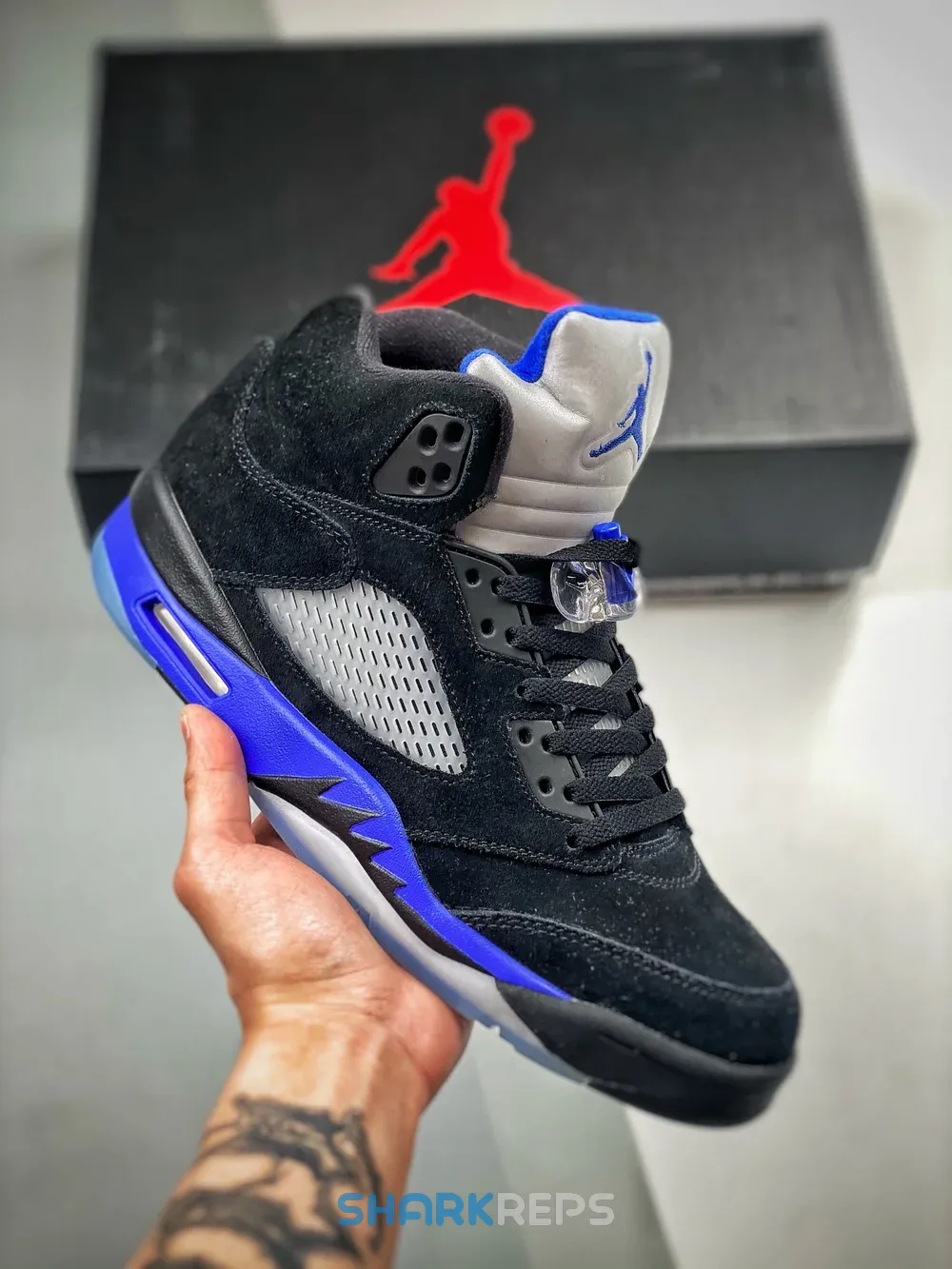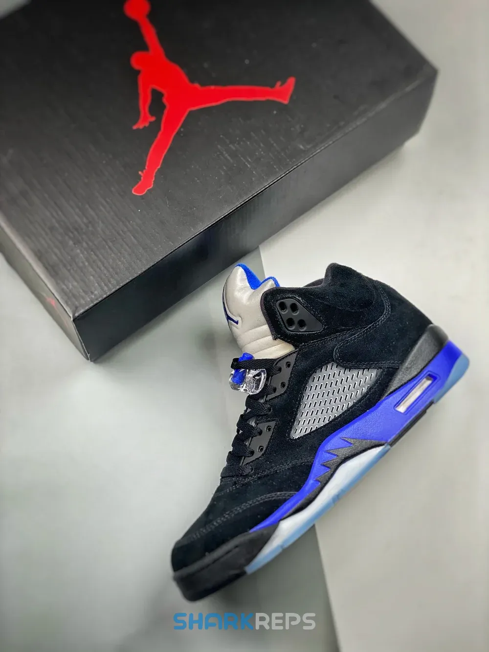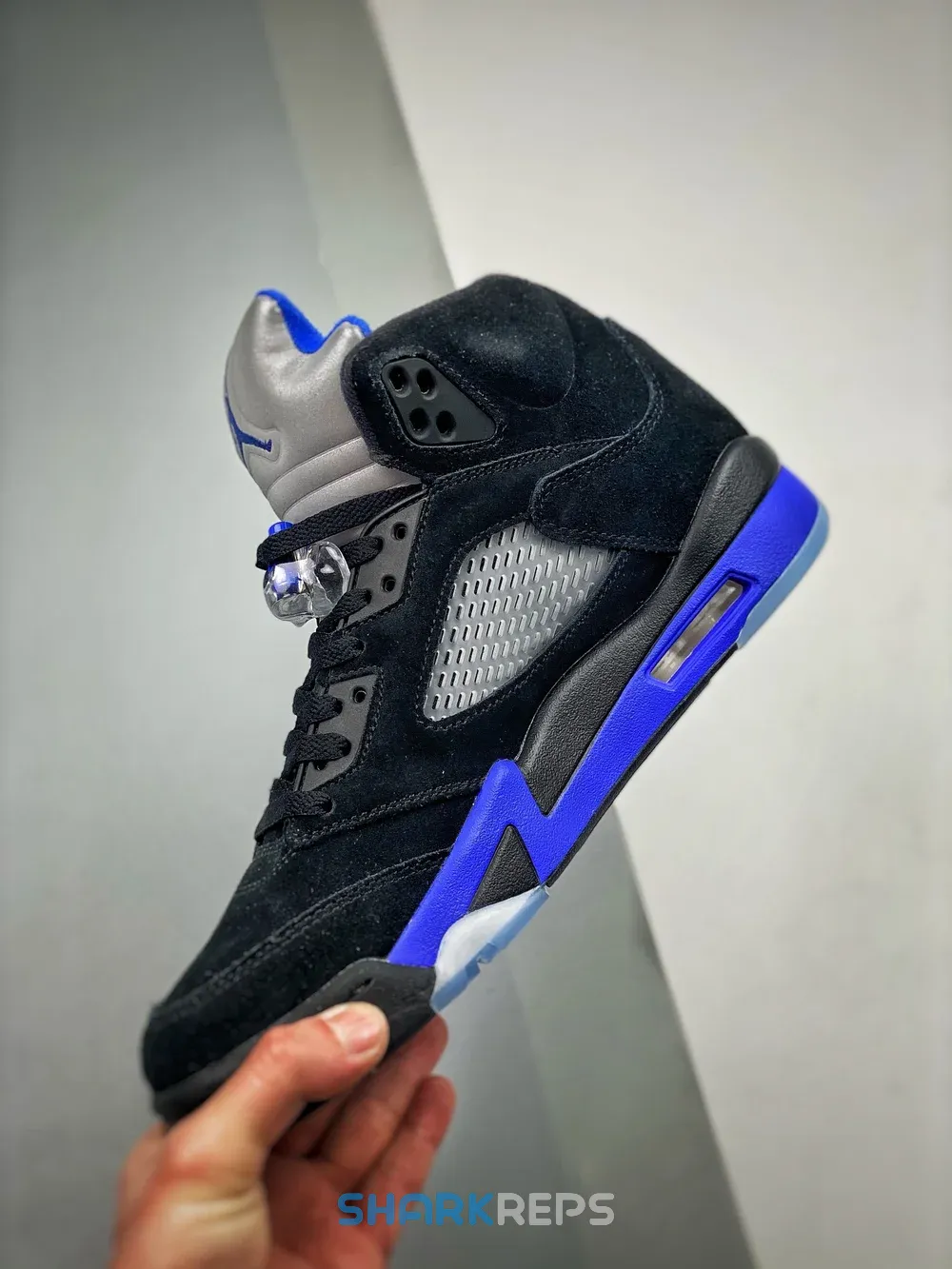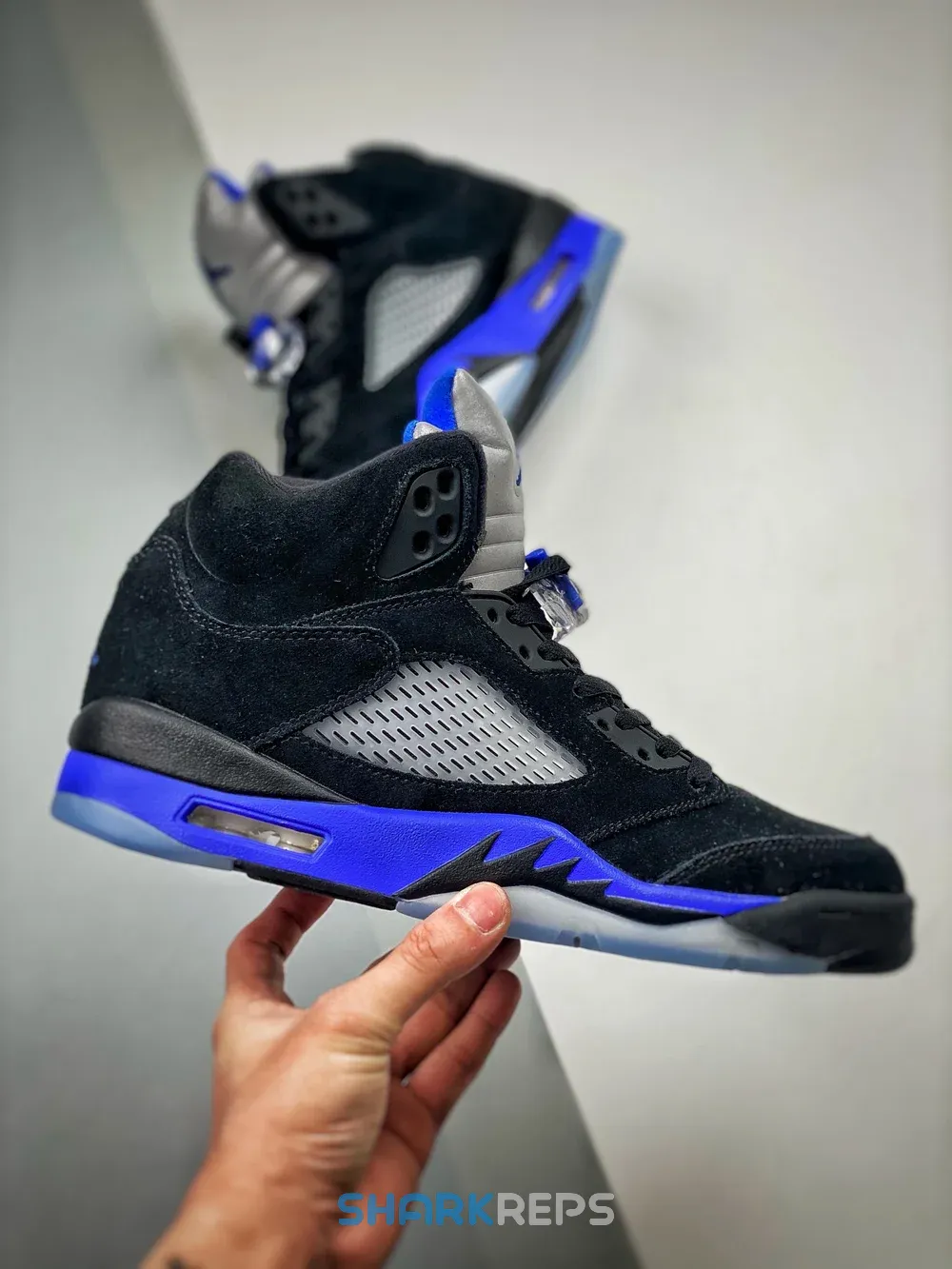 The Air Jordan 5 Retro ‘Racer Blue’ adds color-popped accents to a stealthy colorway of the venerable 1990 silhouette, designed by Tinker Hatfield and introduced to the world by Mars Blackmon. The mid-top makes use of a black nubuck upper with tonal TPU eyelets, translucent quarter panel netting and a reflective silver tongue. The latter features contrasting hits of royal blue on the embroidered Jumpman and interior lining. Lightweight cushioning arrives via a blue polyurethane midsole, embellished with black shark tooth detailing and fitted with visible Air-sole cushioning in the heel. A translucent rubber outsole provides grippy traction underfoot.