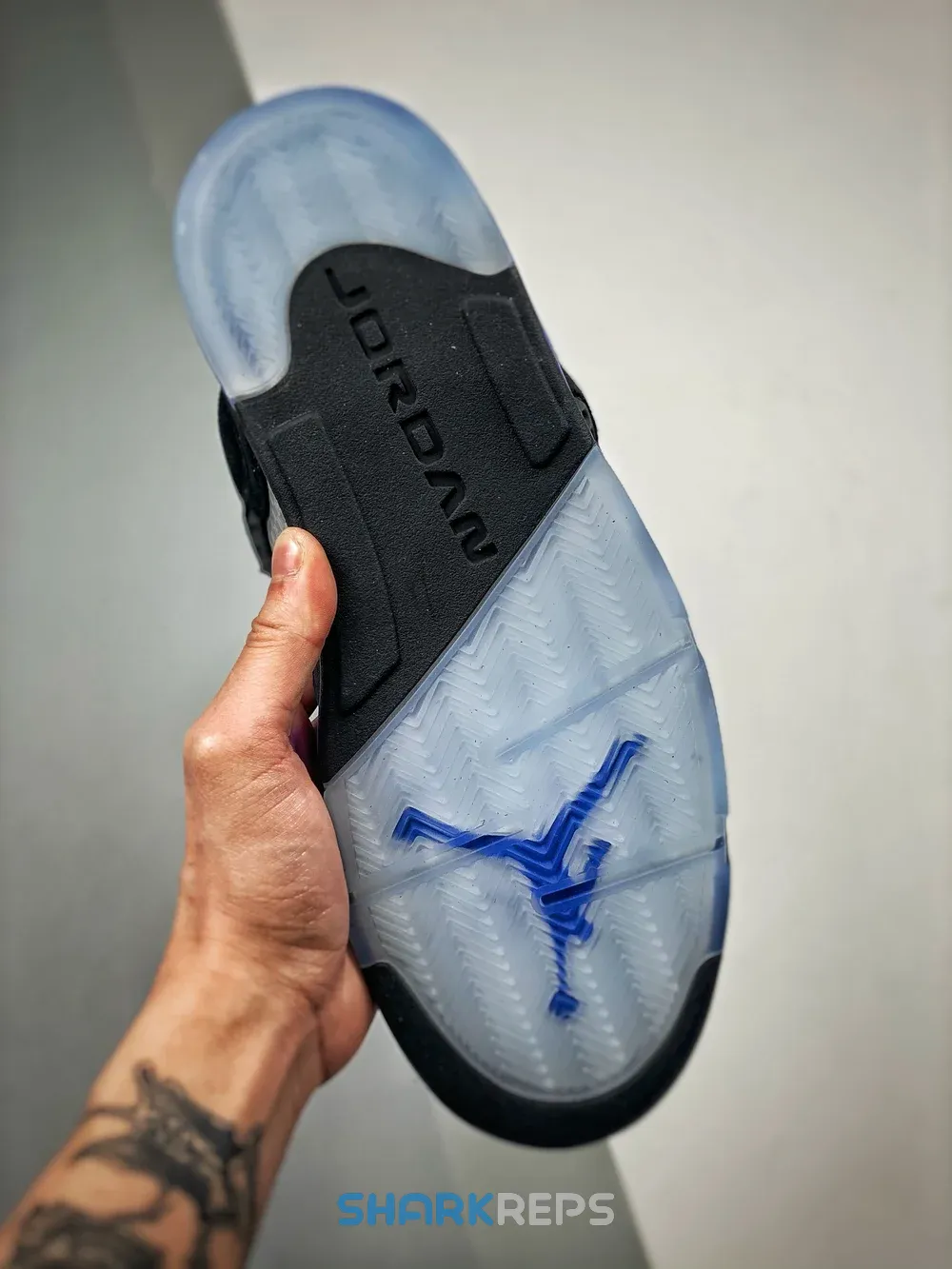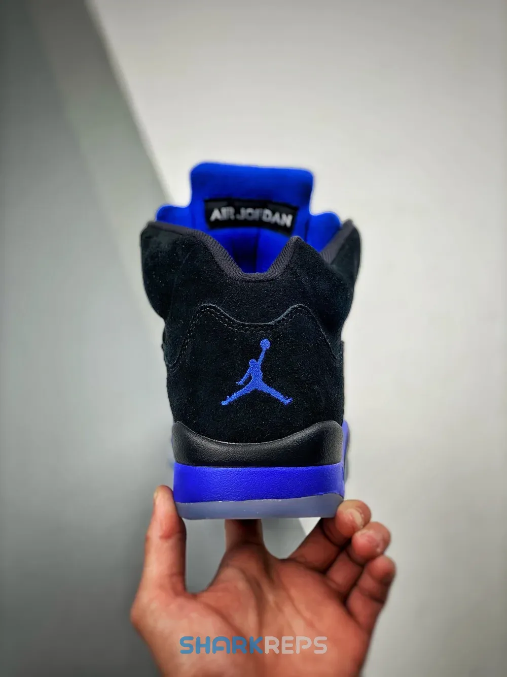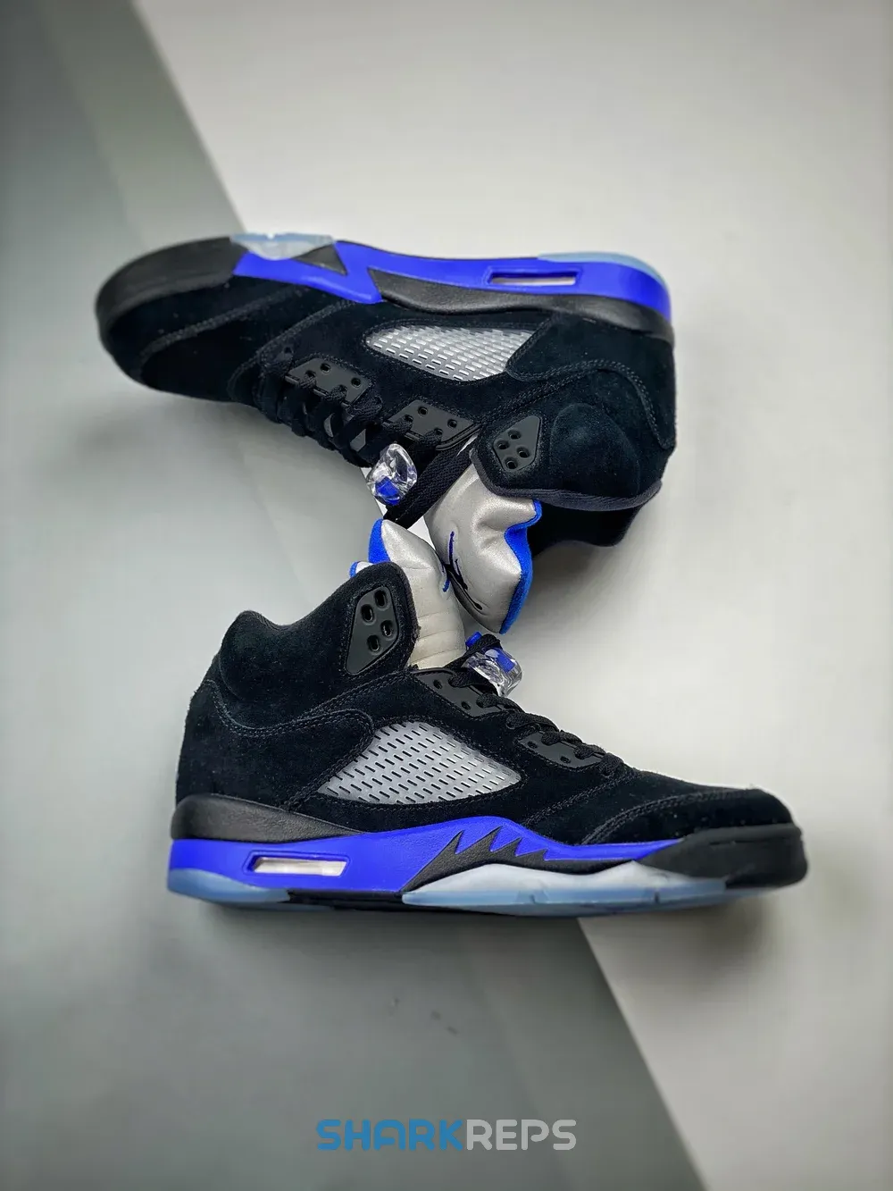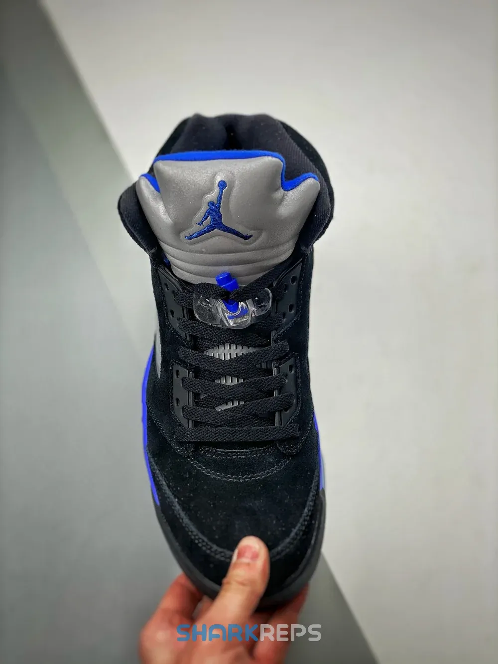 The Air Jordan 5 Retro ‘Racer Blue’ adds color-popped accents to a stealthy colorway of the venerable 1990 silhouette, designed by Tinker Hatfield and introduced to the world by Mars Blackmon. The mid-top makes use of a black nubuck upper with tonal TPU eyelets, translucent quarter panel netting and a reflective silver tongue. The latter features contrasting hits of royal blue on the embroidered Jumpman and interior lining. Lightweight cushioning arrives via a blue polyurethane midsole, embellished with black shark tooth detailing and fitted with visible Air-sole cushioning in the heel. A translucent rubber outsole provides grippy traction underfoot.