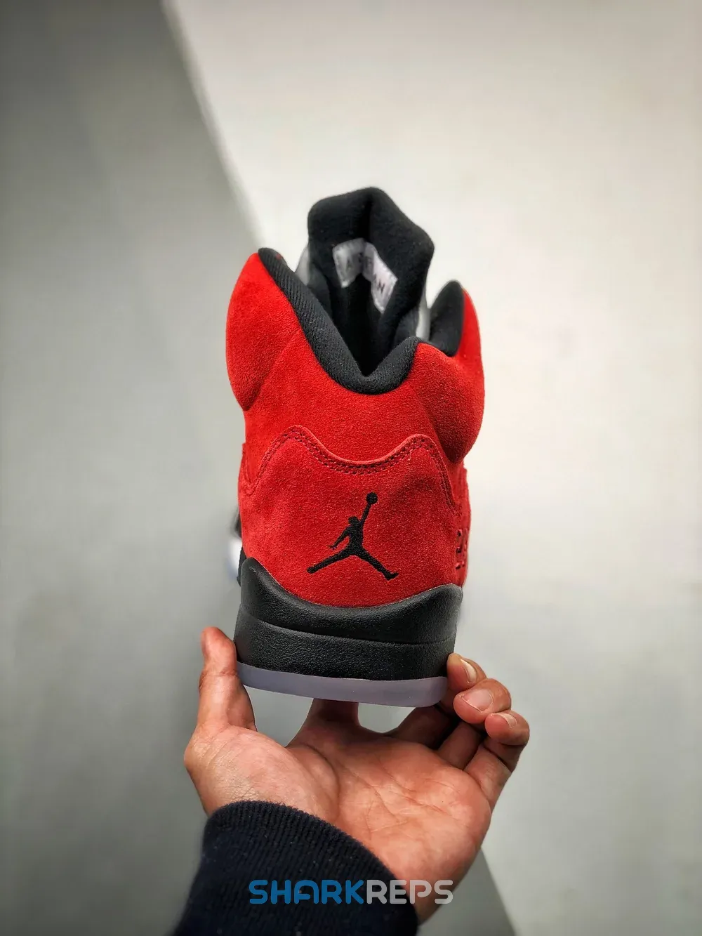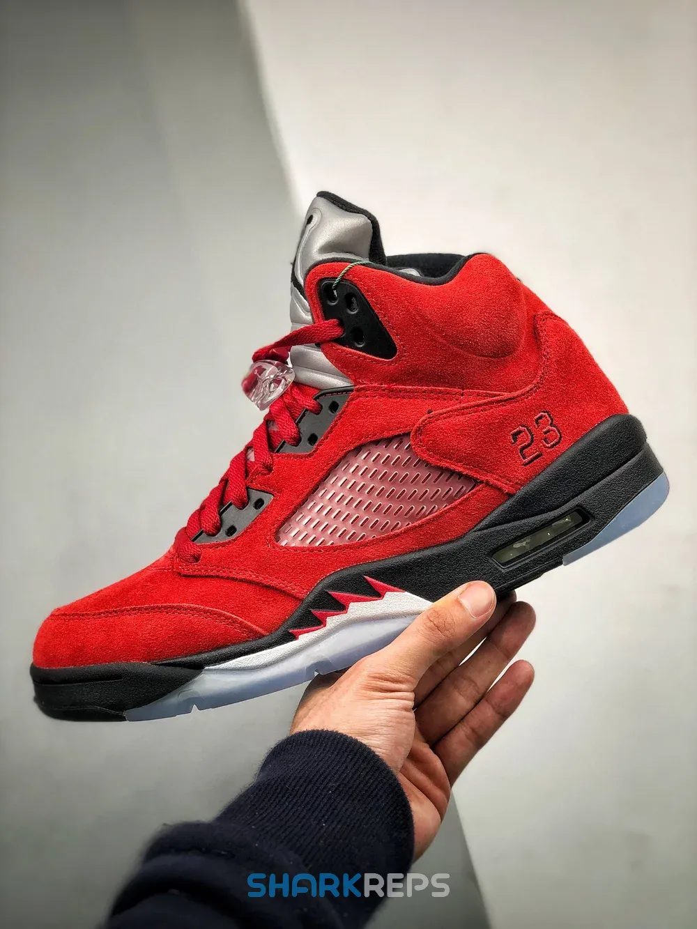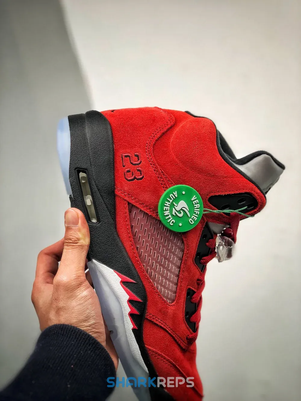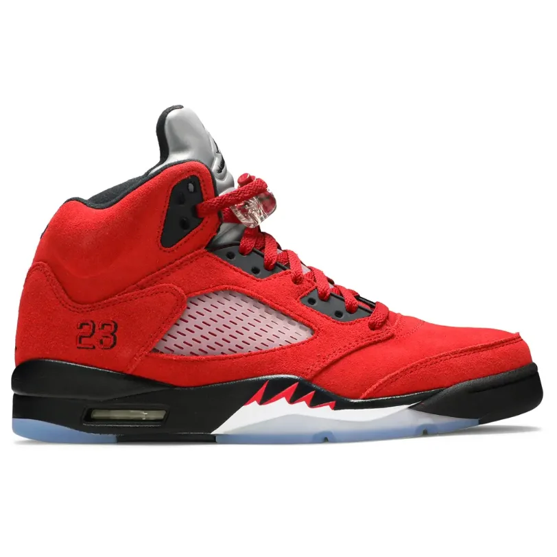 The 2021 reissue of the Air Jordan 5 Retro ‘Raging Bull’ brings back a beloved colorway originally released as one-half of 2009’s Air Jordan 5 Raging Bulls Pack. The shoe’s defining feature is a plush Varsity Red suede upper, equipped with black eyelets and a Jumpman-branded reflective silver tongue. The heel overlay displays a second Jumpman logo and an embroidered 23 on the lateral side. A visible Nike Air heel unit enhances the polyurethane midsole, accented with red-tipped shark tooth detailing and supported by an icy translucent outsole.