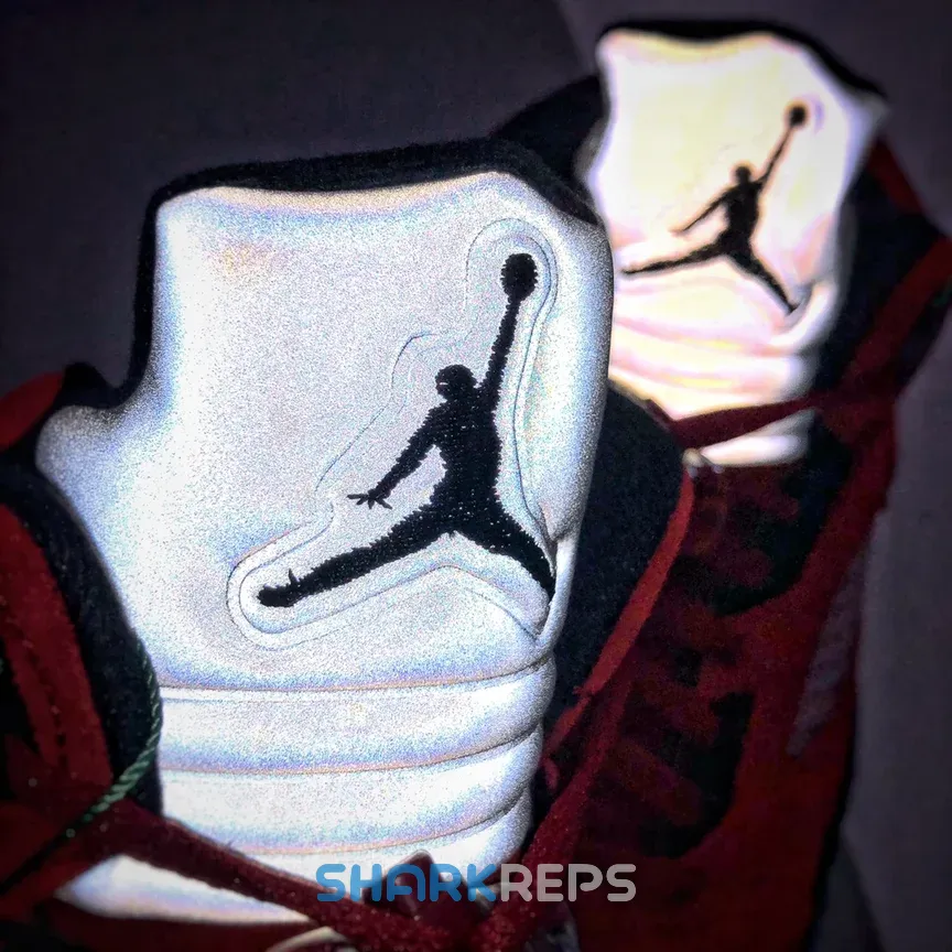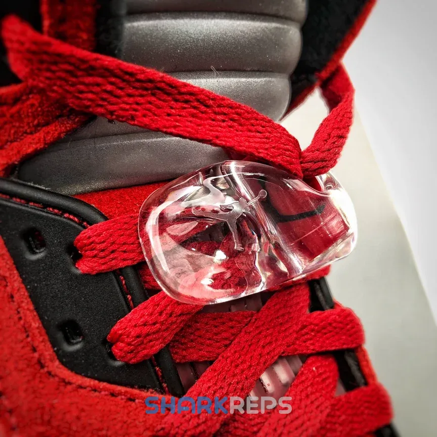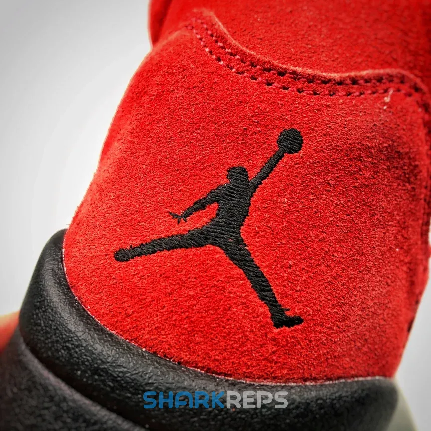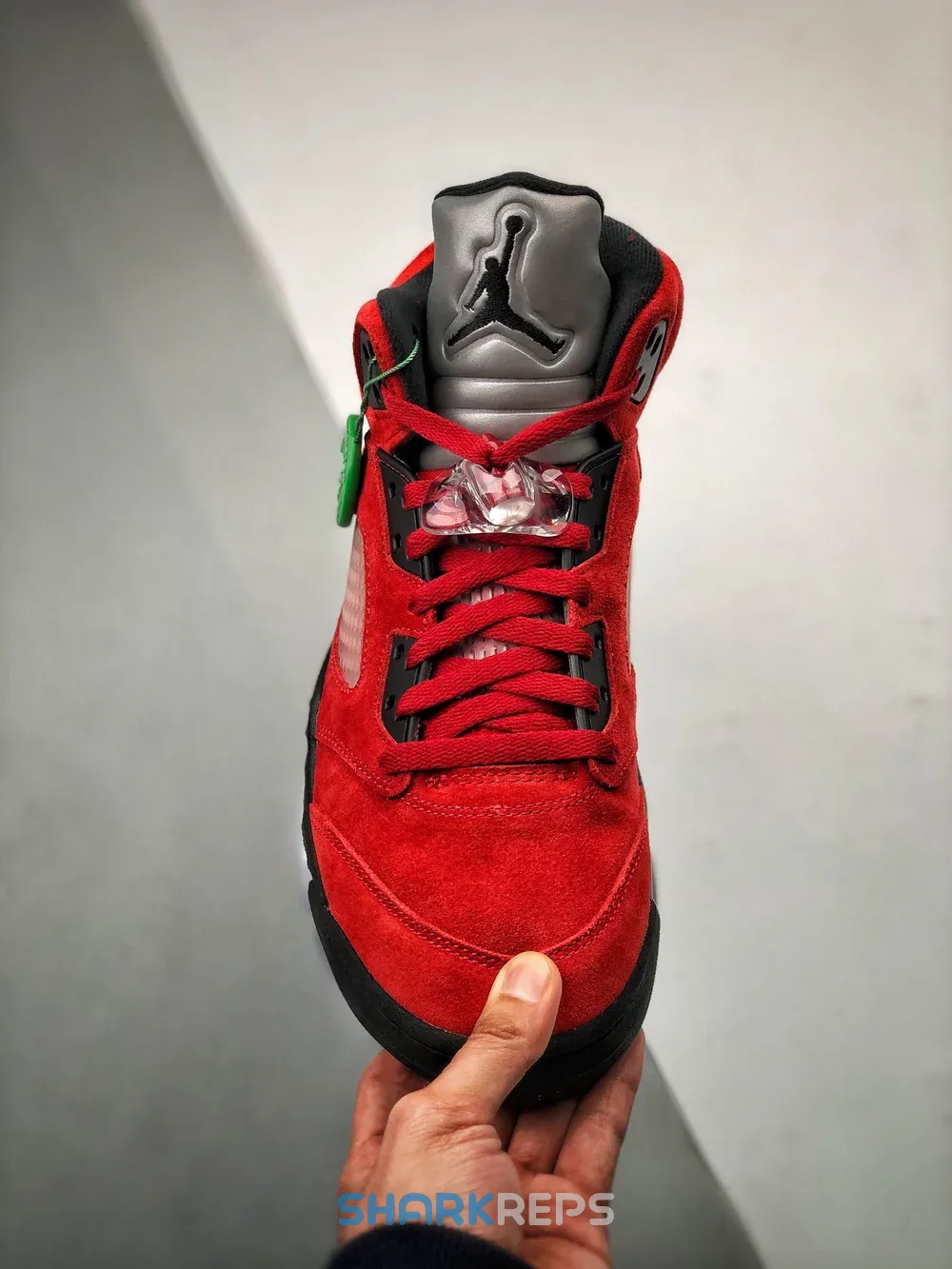 The 2021 reissue of the Air Jordan 5 Retro ‘Raging Bull’ brings back a beloved colorway originally released as one-half of 2009’s Air Jordan 5 Raging Bulls Pack. The shoe’s defining feature is a plush Varsity Red suede upper, equipped with black eyelets and a Jumpman-branded reflective silver tongue. The heel overlay displays a second Jumpman logo and an embroidered 23 on the lateral side. A visible Nike Air heel unit enhances the polyurethane midsole, accented with red-tipped shark tooth detailing and supported by an icy translucent outsole.