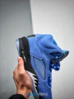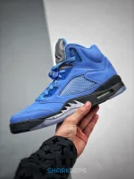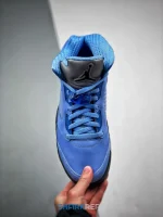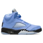 The Air Jordan 5 Retro SE ‘UNC’ showcases a familiar pastel hue inspired by Michael Jordan’s alma mater. The upper is crafted from University Blue nubuck with tonal TPU eyelets, ventilated quarter-panel netting and a woven jock tag at the heel. An embroidered Jumpman decorates the tongue, rendered in a reflective silver finish for added visibility in low-light conditions. Lightweight cushioning comes courtesy of a black polyurethane midsole, accented with speckled shark-tooth detailing and fitted with a visible Air-sole unit in the heel. Underfoot, a translucent herringbone-traction outsole provides optimal grip.