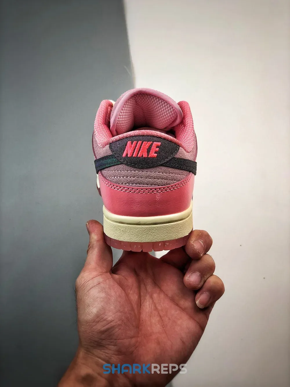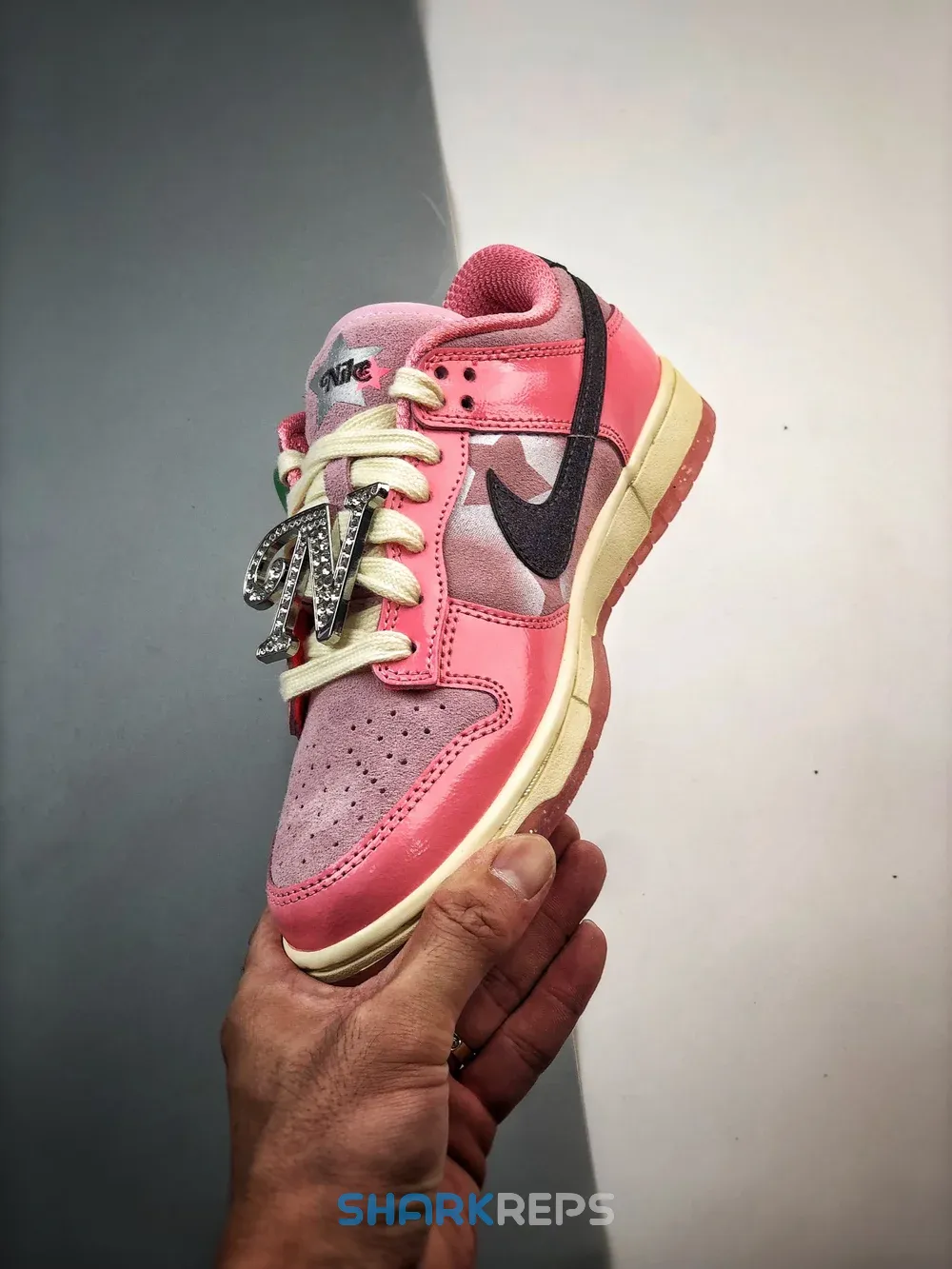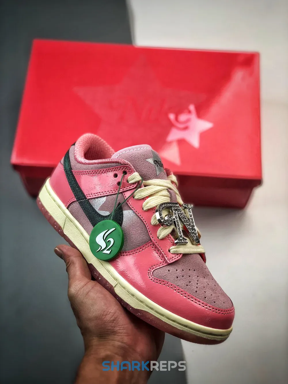 The Nike Women’s Dunk Low LX ‘Barbie’ dresses the heritage hoops shoe with colors and details that reflect the aesthetic of the iconic Mattel toy. Varying shades of pink are executed on the upper, featuring a suede base with glossy synthetic leather overlays at the forefoot and heel. Tonal stars decorate the quarter panel, overlaid with a signature Swoosh in a sparkly finish. Encrusted with faux diamonds, an oversized N-shaped lace jewel adds a luxurious flourish. An aged off-white finish is applied to the midsole, supported by a pink-tinged, glittery outsole in translucent rubber.