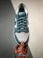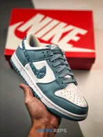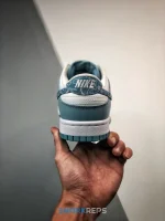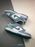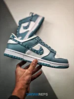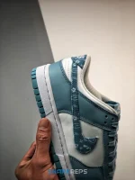The Nike women’s Dunk Low ‘Blue Paisley’ gives the classic silhouette a subtle makeover, highlighted by patterned detailing and a simple two-tone color scheme. Smooth white leather is utilized on the upper, contrasted by powder blue overlays at the forefoot and heel. Paisley print textile appears on the signature Swoosh and Nike-branded back tab. The low-top sits on a traditional rubber cupsole, featuring white sidewalls and a grippy blue rubber outsole.