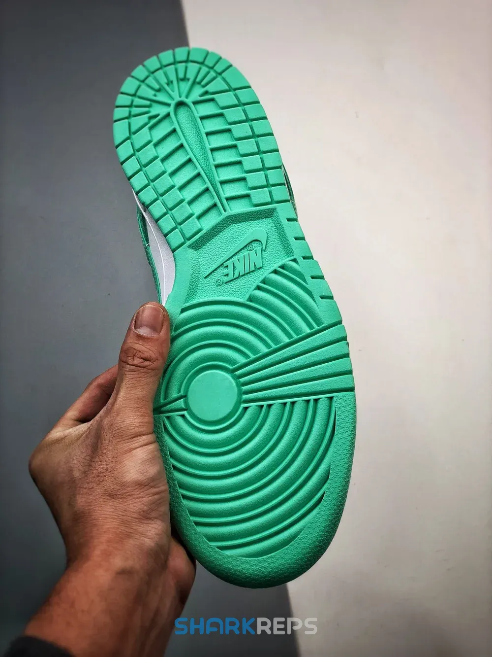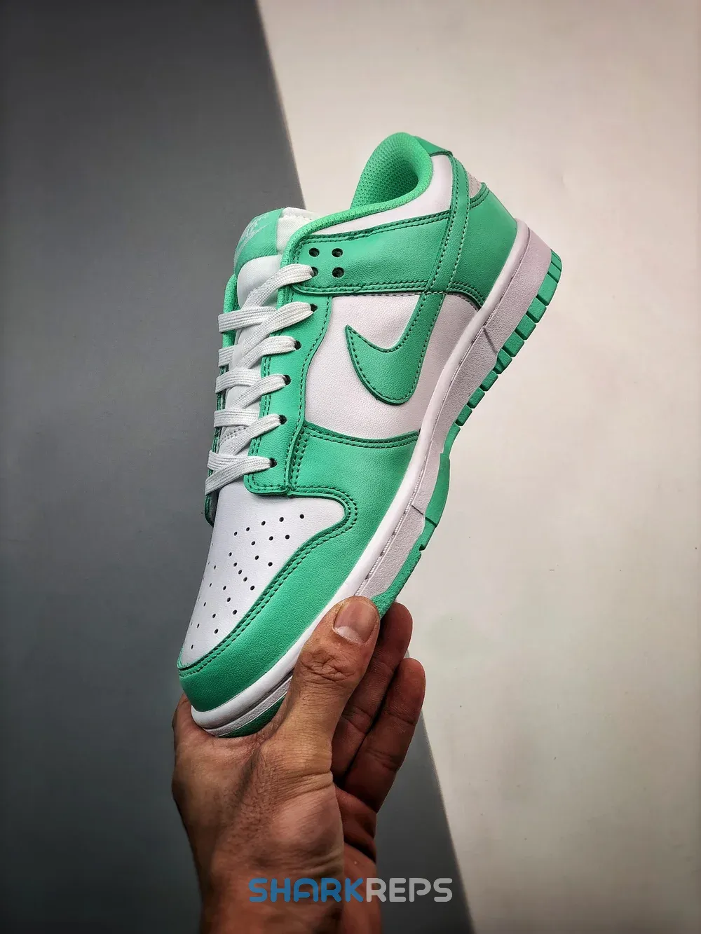 The Nike women’s Dunk Low ‘Green Glow’ showcases traditional color blocking on a customary all-leather build. A crisp white base is contrasted by a vibrant shade of green on the sneaker’s eyestay, Swoosh, and forefoot and heel overlays. The verdant hue is repeated on the woven tongue tag and heel tab, both marked with standard Nike branding. The low-top rides on a two-tone rubber cupsole, equipped with a grippy outsole originally designed for pivoting on the hardwood.