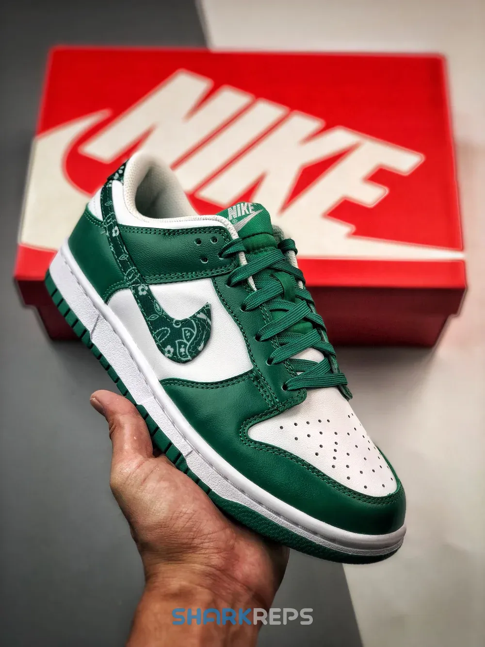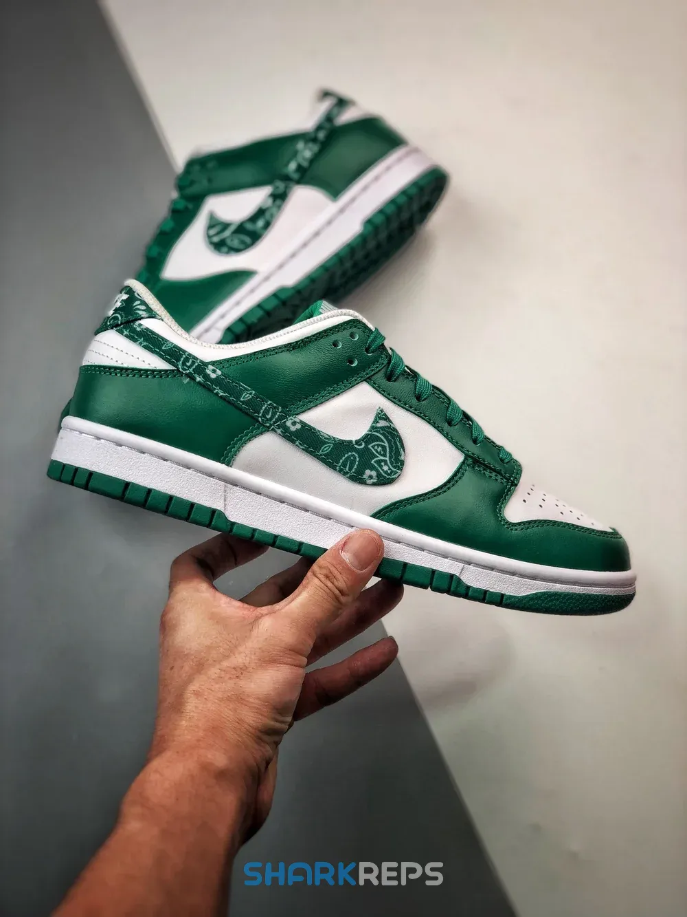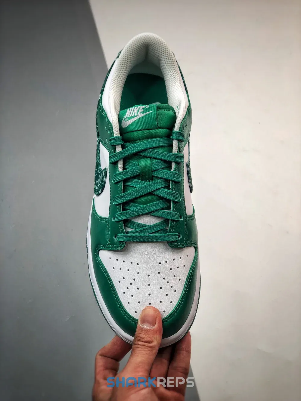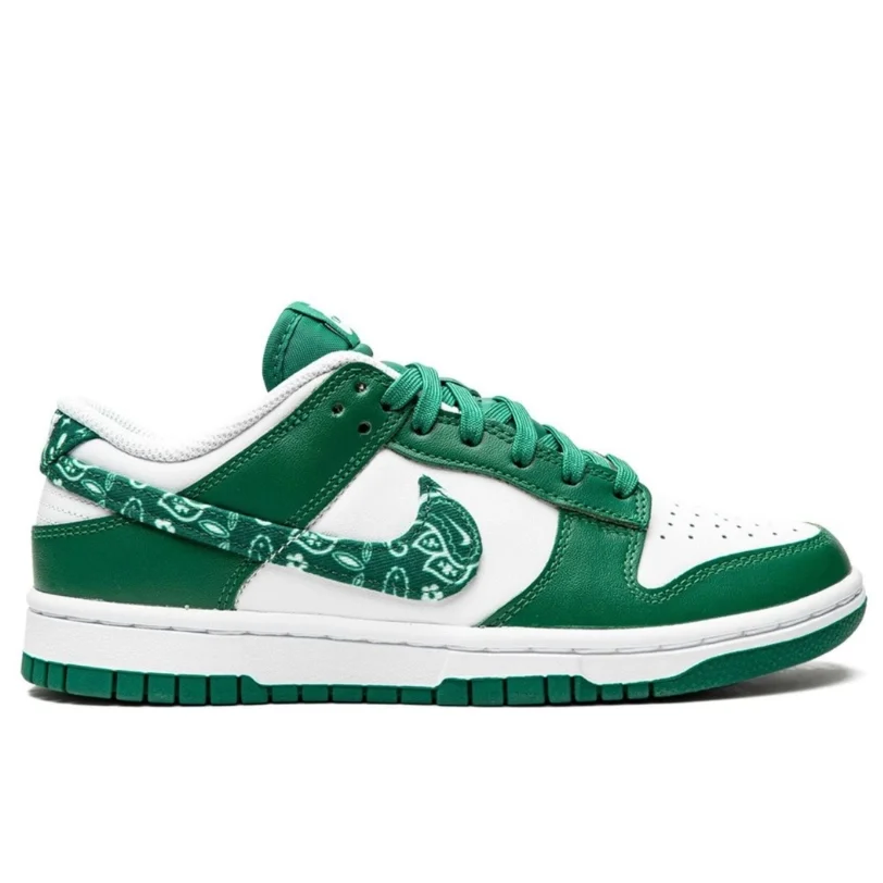 The Nike women’s Dunk Low ‘Green Paisley’ updates the vintage hoops shoe with a patterned Swoosh. The signature branding element is covered in green paisley-print textile, along with a heel tab marked with embroidered Nike lettering. The rest of the upper is clad in white leather with contrasting green leather overlays at the forefoot and heel. Atop the breathable nylon tongue, a woven tag displays traditional Nike branding. The sneaker is mounted on a standard rubber cupsole, featuring white sidewalls and a green rubber outsole.