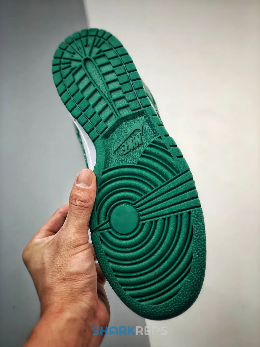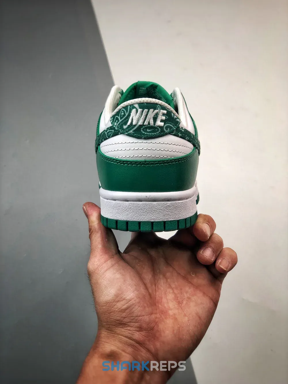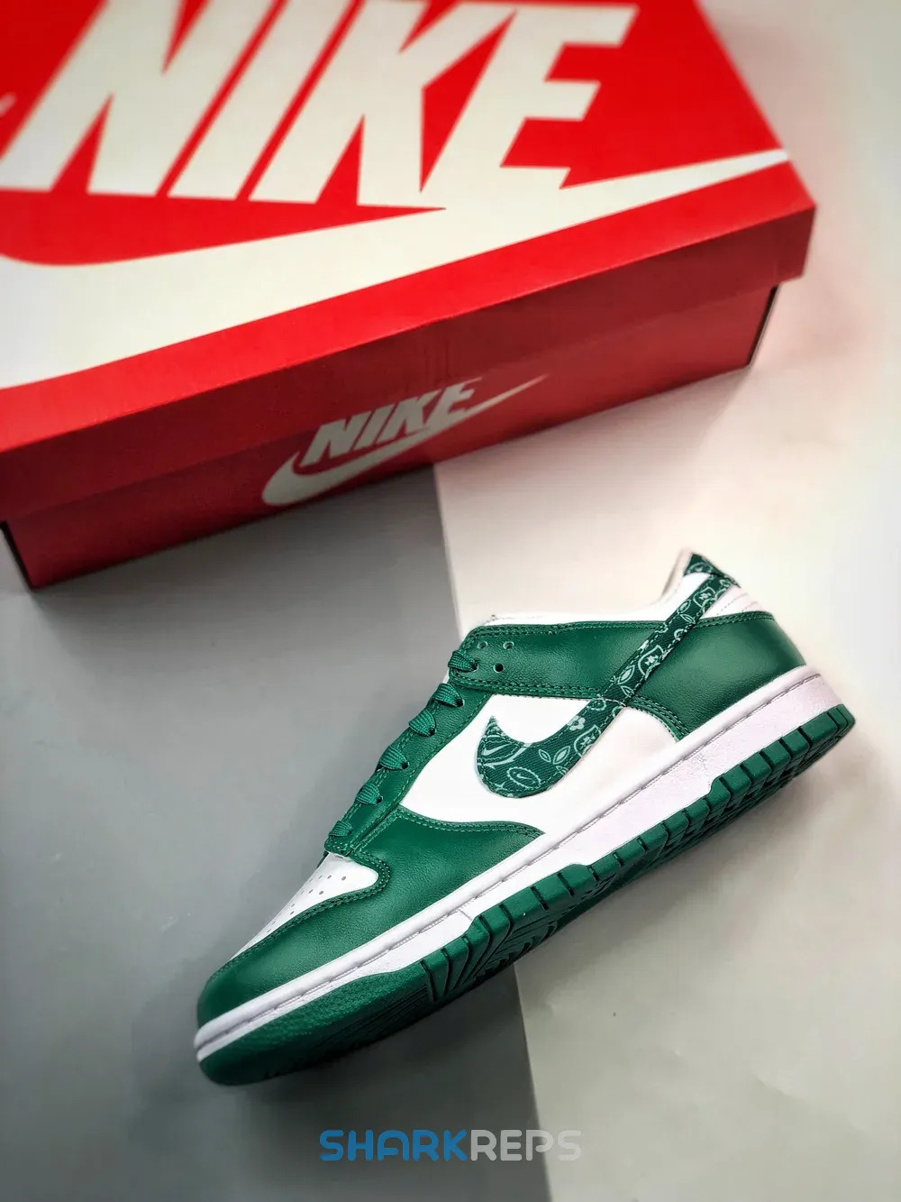 The Nike women’s Dunk Low ‘Green Paisley’ updates the vintage hoops shoe with a patterned Swoosh. The signature branding element is covered in green paisley-print textile, along with a heel tab marked with embroidered Nike lettering. The rest of the upper is clad in white leather with contrasting green leather overlays at the forefoot and heel. Atop the breathable nylon tongue, a woven tag displays traditional Nike branding. The sneaker is mounted on a standard rubber cupsole, featuring white sidewalls and a green rubber outsole.