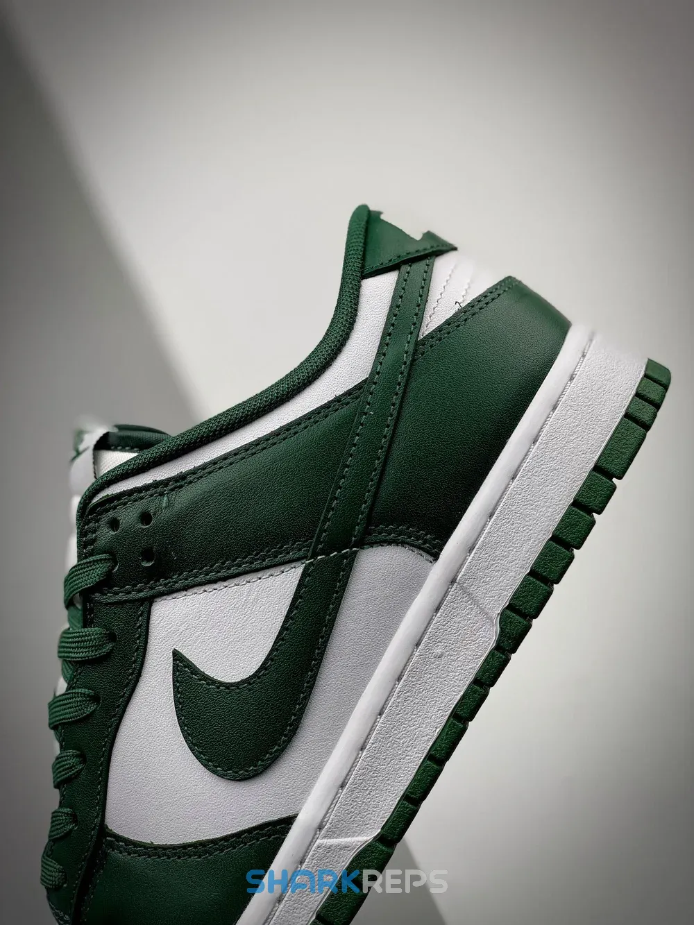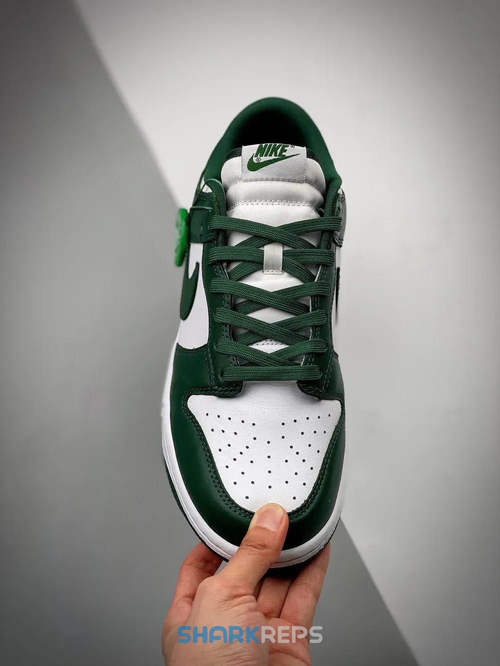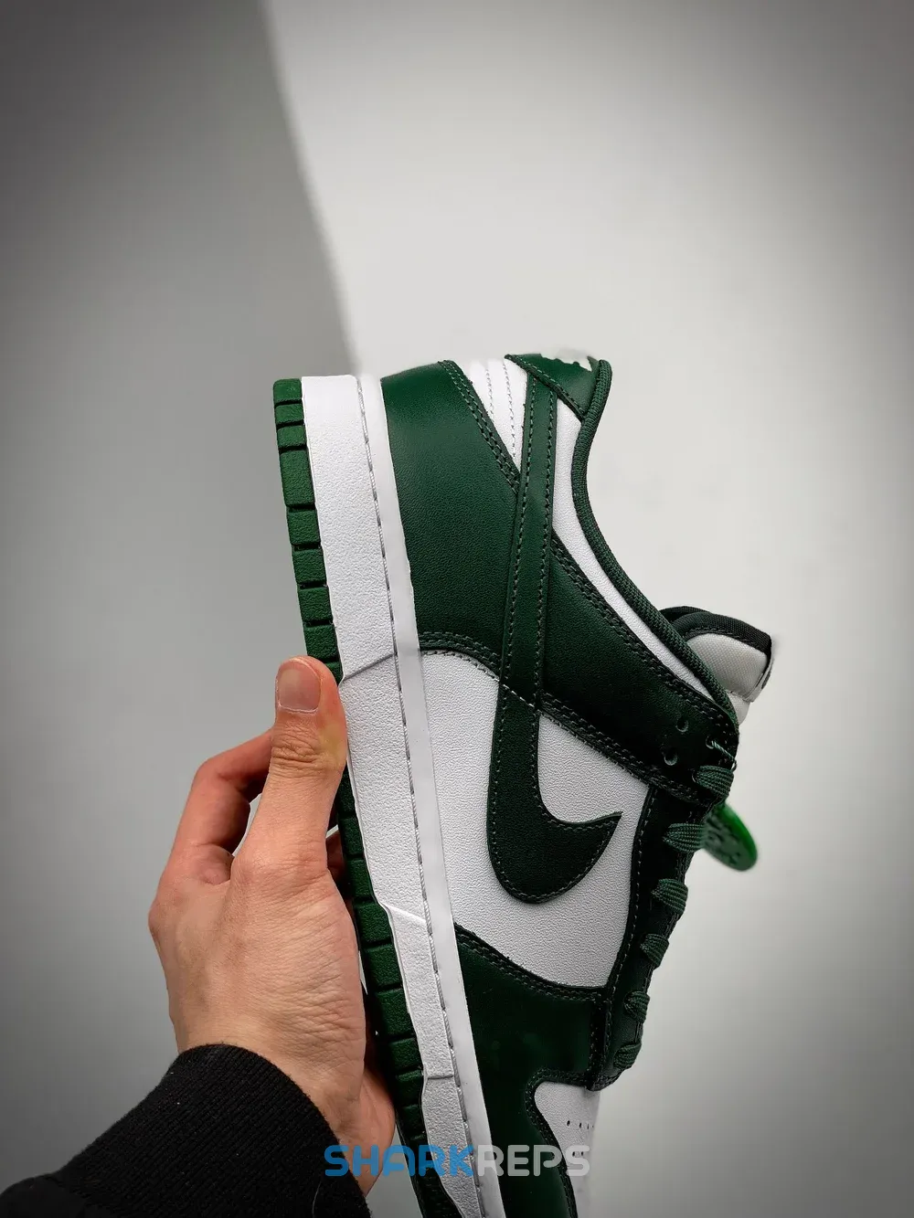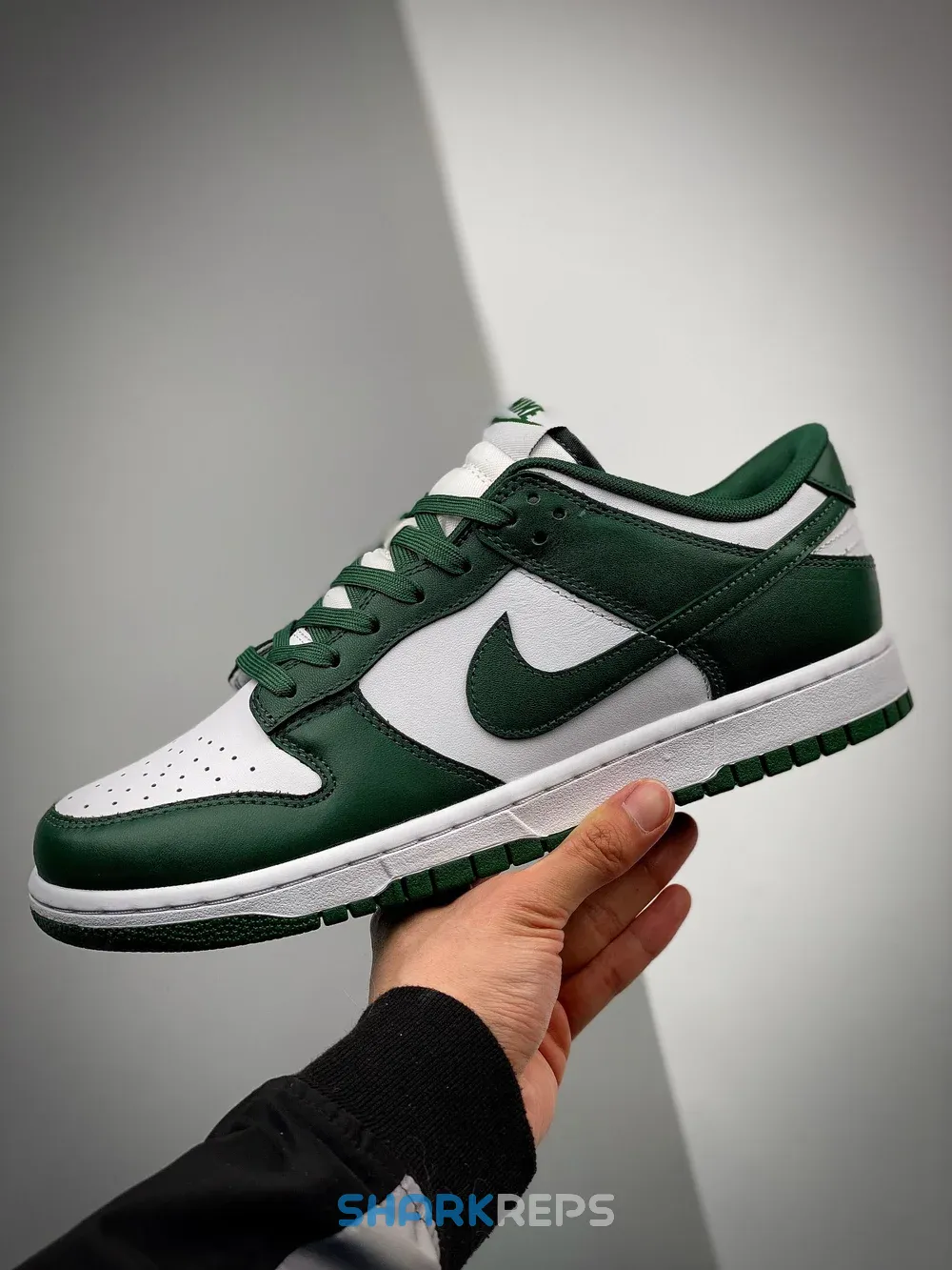 The Nike Dunk Low ‘Michigan State’ delivers a low-top version of the Michigan State Dunk from 2020. Like its predecessor, the shoe features a two-tone all-leather upper rendered in classic ‘Be True to Your School’ color blocking. A stark white finish is contrasted by a dark green Swoosh and matching overlays at the toe and heel. Standard Nike branding hits decorate the heel and nylon tongue. The low-top is mounted on a durable rubber outsole, complete with a traction pattern originally developed for the hardwood.