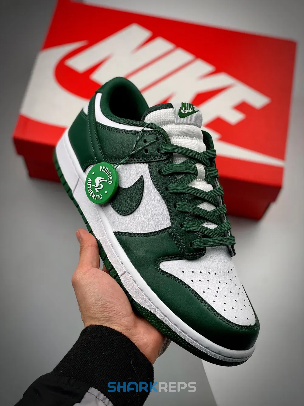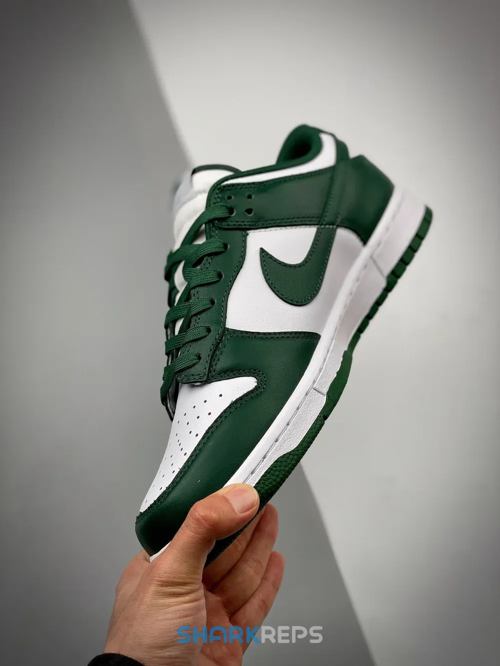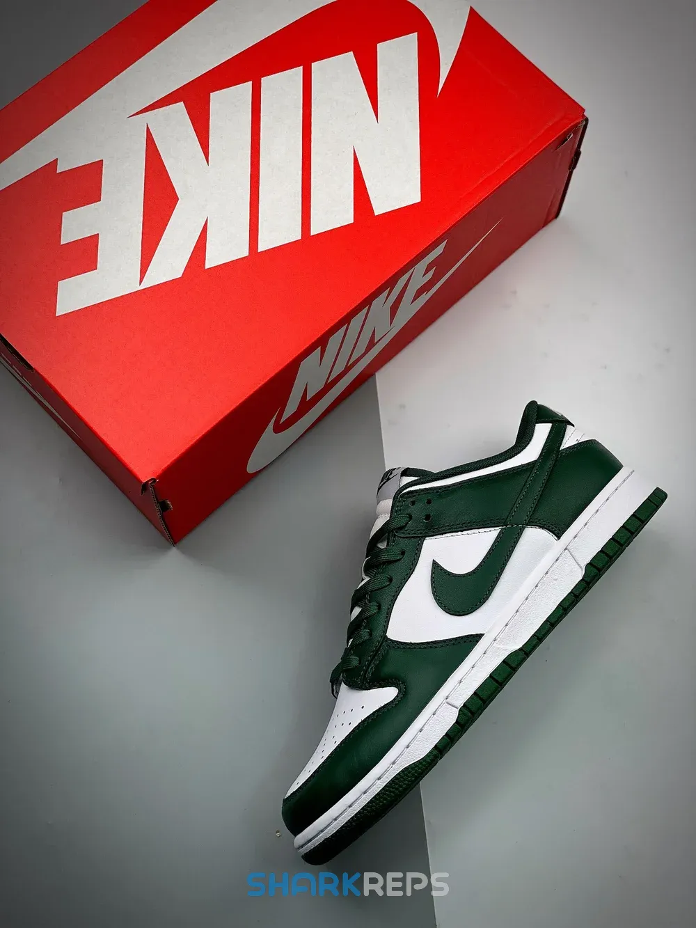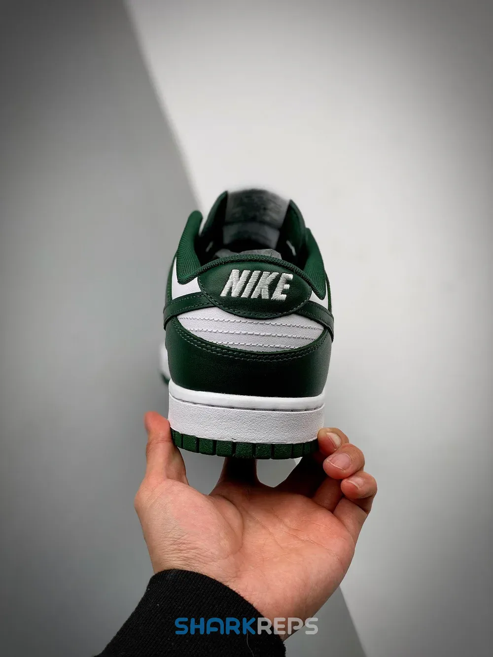 The Nike Dunk Low ‘Michigan State’ delivers a low-top version of the Michigan State Dunk from 2020. Like its predecessor, the shoe features a two-tone all-leather upper rendered in classic ‘Be True to Your School’ color blocking. A stark white finish is contrasted by a dark green Swoosh and matching overlays at the toe and heel. Standard Nike branding hits decorate the heel and nylon tongue. The low-top is mounted on a durable rubber outsole, complete with a traction pattern originally developed for the hardwood.