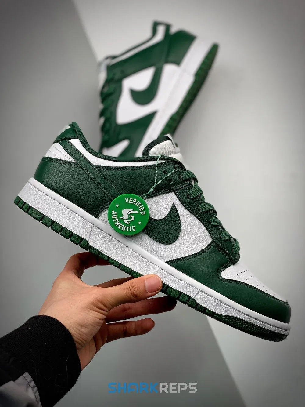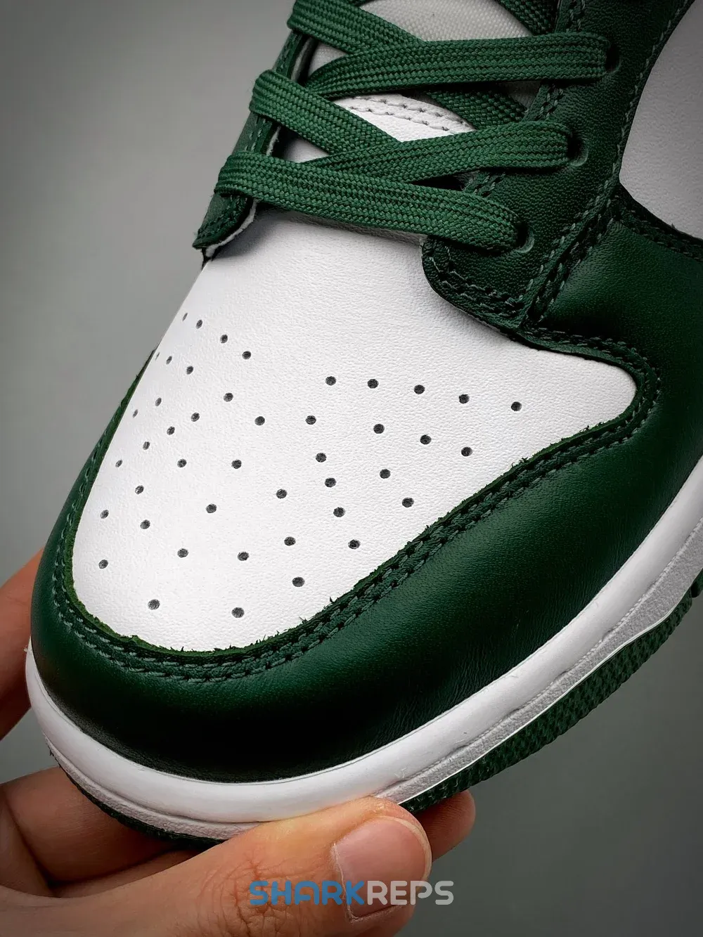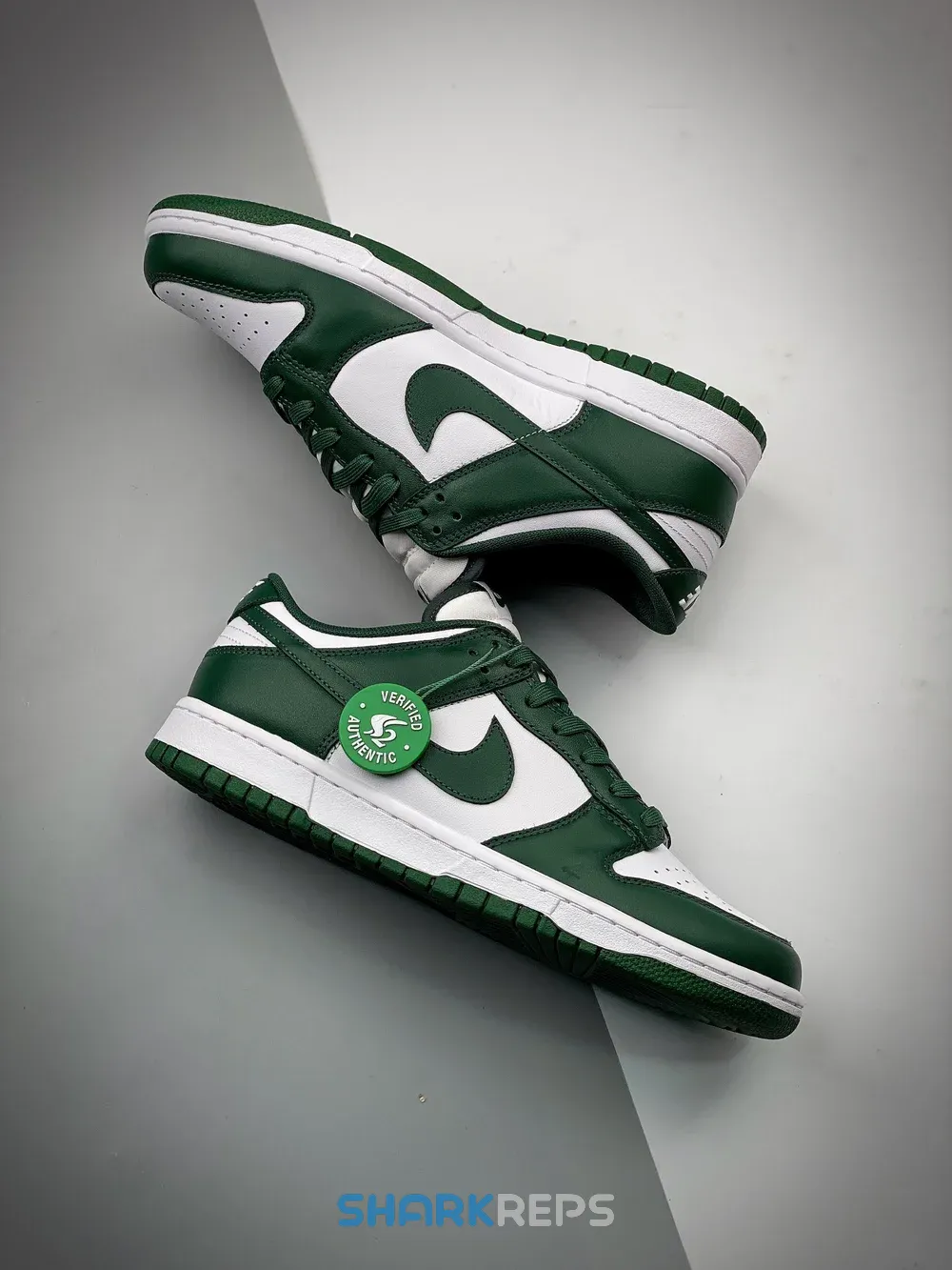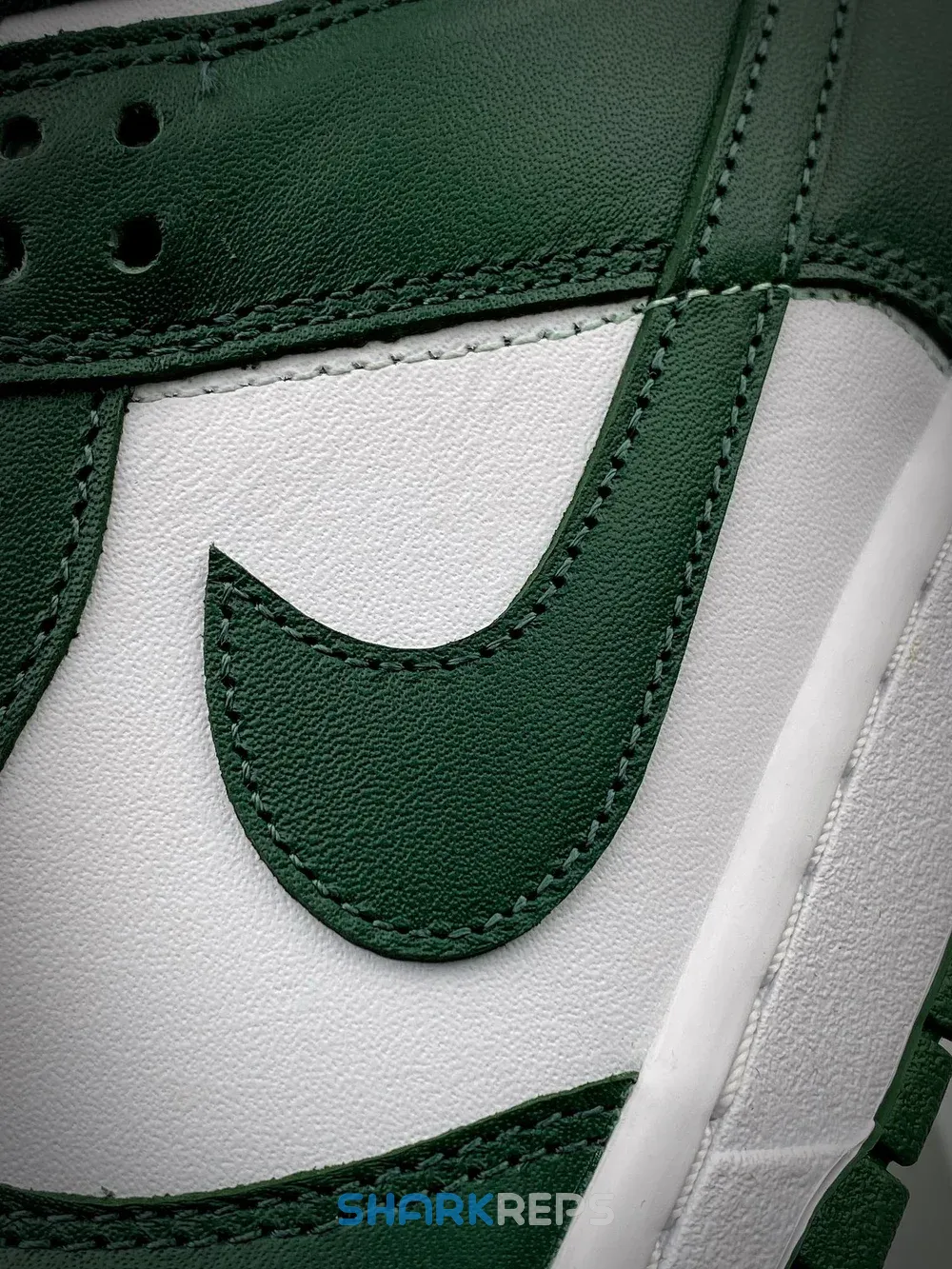 The Nike Dunk Low ‘Michigan State’ delivers a low-top version of the Michigan State Dunk from 2020. Like its predecessor, the shoe features a two-tone all-leather upper rendered in classic ‘Be True to Your School’ color blocking. A stark white finish is contrasted by a dark green Swoosh and matching overlays at the toe and heel. Standard Nike branding hits decorate the heel and nylon tongue. The low-top is mounted on a durable rubber outsole, complete with a traction pattern originally developed for the hardwood.