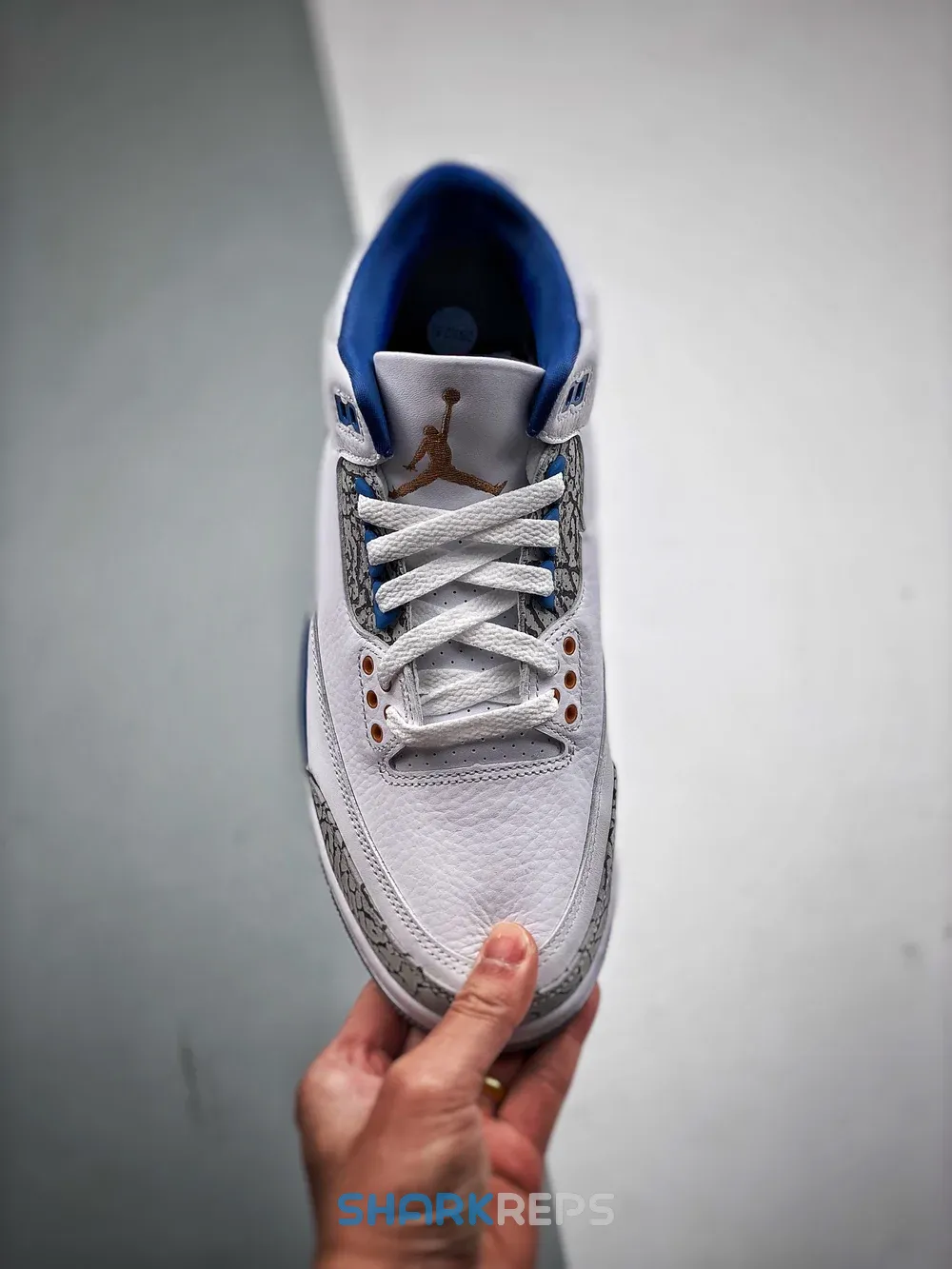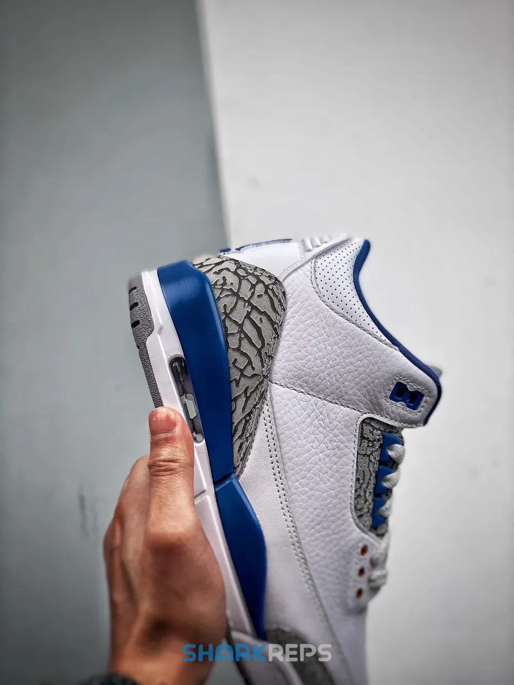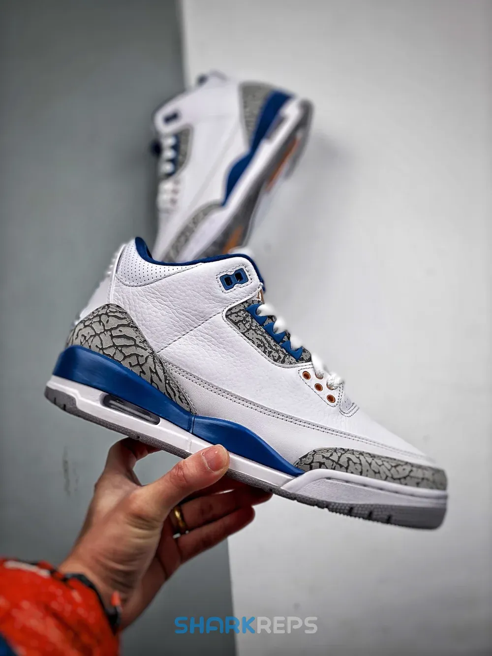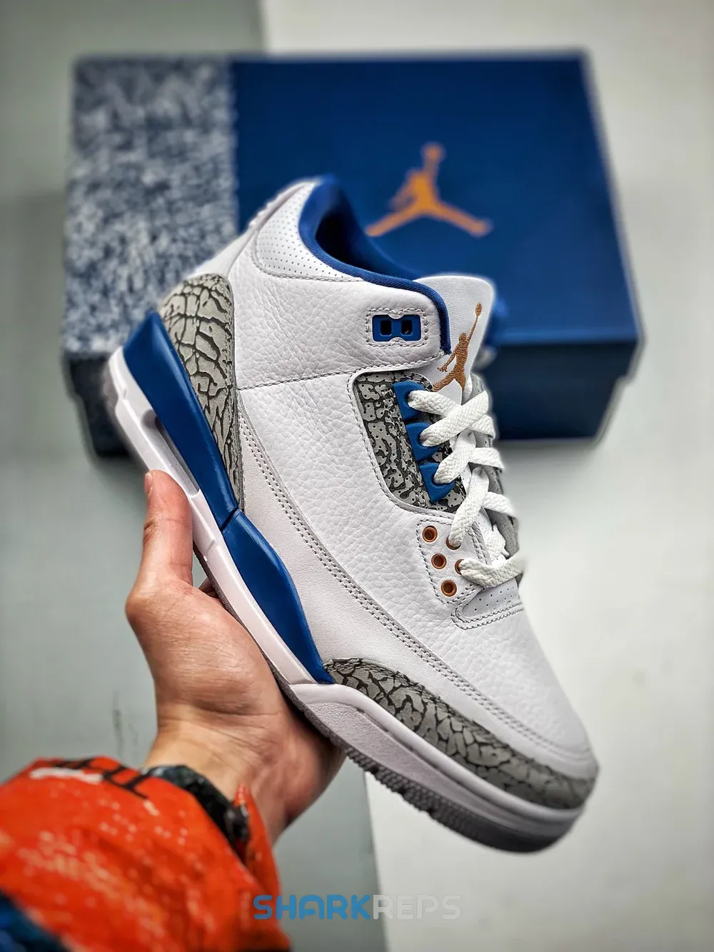 The Air Jordan 3 Retro ‘Washington Wizards’ showcases a familiar design based on a PE colorway that Michael Jordan wore during his time in D.C. Featuring color blocking reminiscent of the OG ‘True Blue’ edition from 1988, the classic silhouette makes use of a white tumbled leather upper with grey elephant-print overlays at the toe and heel. Contrasting blue accents appear on the interior lining, molded eyelets, and the raised Jumpman logo that decorates the heel tab. A second Jumpman graces the tongue in copper-colored embroidery, matching the circular eyelets that dot the forefoot. The mid-top is mounted on a two-tone polyurethane midsole, equipped with a visible Air-sole heel unit and supported by a durable grey rubber outsole.