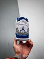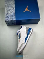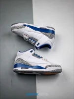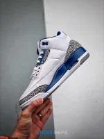 The Air Jordan 3 Retro ‘Washington Wizards’ showcases a familiar design based on a PE colorway that Michael Jordan wore during his time in D.C. Featuring color blocking reminiscent of the OG ‘True Blue’ edition from 1988, the classic silhouette makes use of a white tumbled leather upper with grey elephant-print overlays at the toe and heel. Contrasting blue accents appear on the interior lining, molded eyelets, and the raised Jumpman logo that decorates the heel tab. A second Jumpman graces the tongue in copper-colored embroidery, matching the circular eyelets that dot the forefoot. The mid-top is mounted on a two-tone polyurethane midsole, equipped with a visible Air-sole heel unit and supported by a durable grey rubber outsole.
