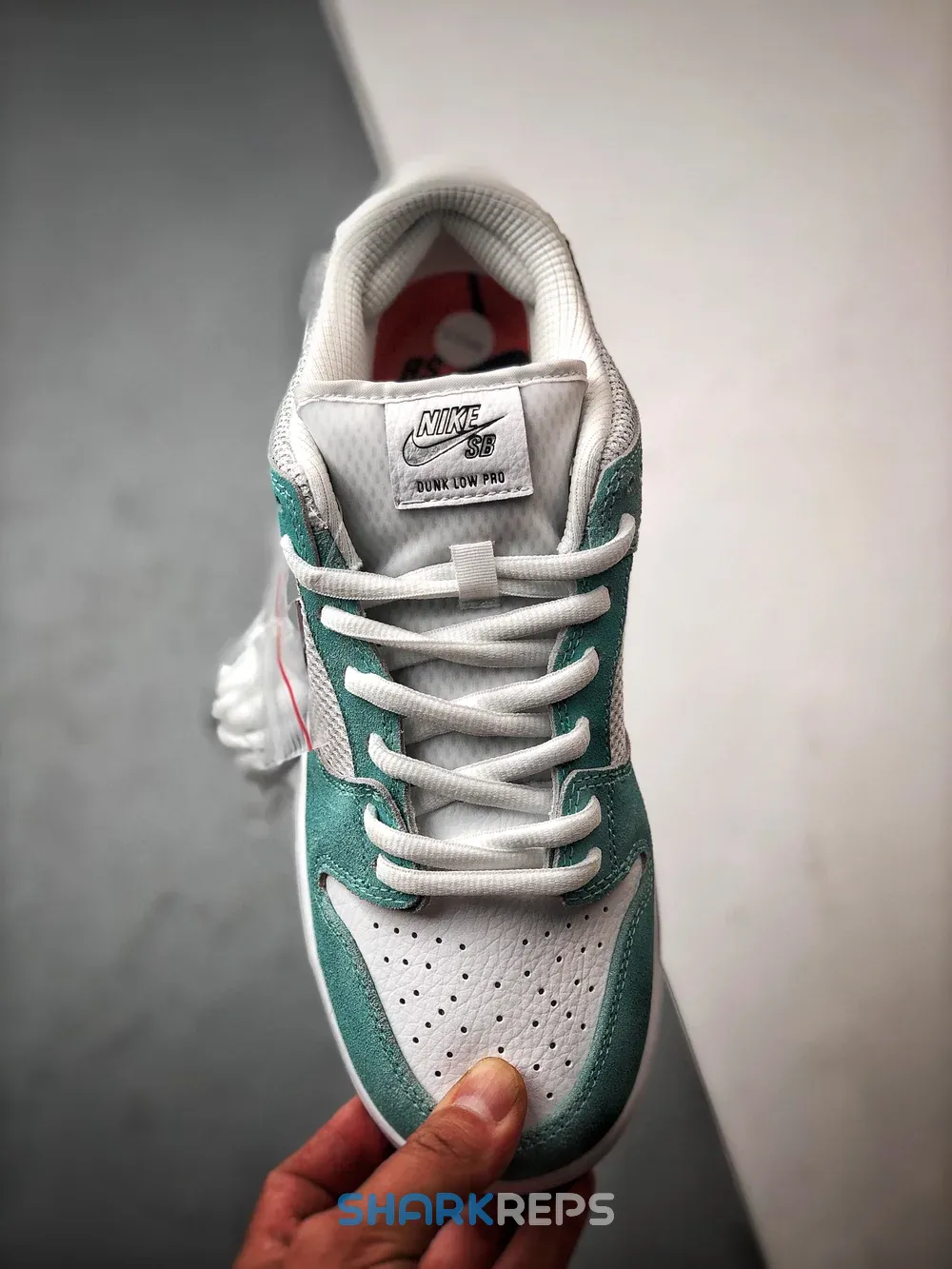 The April Skateboards x Nike Dunk Low SB ‘Turbo Green’ dresses the retro model in an airy white mesh upper, accented with a chrome Swoosh and fortified with suede overlays in a bright teal finish. White leather is utilized on the toe box and back tab, marked with April and Nike SB branding across the left and right shoe. ‘April’ is stamped on the lateral heel, while each tongue tag displays mismatched Nike SB and April logos. Underfoot, a translucent rubber outsole reveals a unique floral graphic.