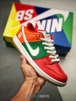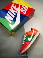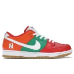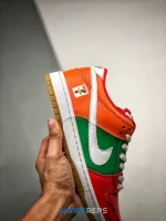 The 7-Eleven x Nike Dunk Low SB pays homage to the multi-national convenience store chain. Originally slated for a 2020 retail launch but never released, the low-top makes use of a color-blocked leather upper in Chile Red, green and Safety Orange. Contrasting white leather accents land on the signature Swoosh and back tab, featuring an embroidered Nike wordmark. A co-branded tag adorns the stuffed mesh tongue, while the 7-Eleven logo graces the lateral heel. Underfoot, a gum rubber outsole provides grippy traction.