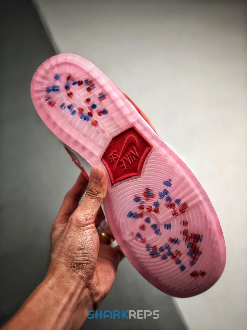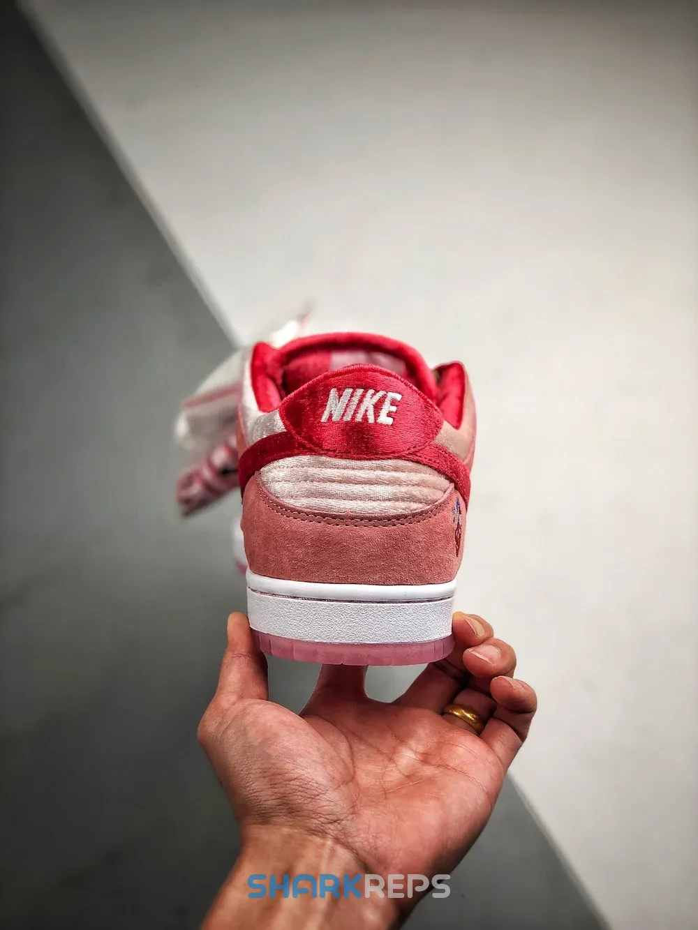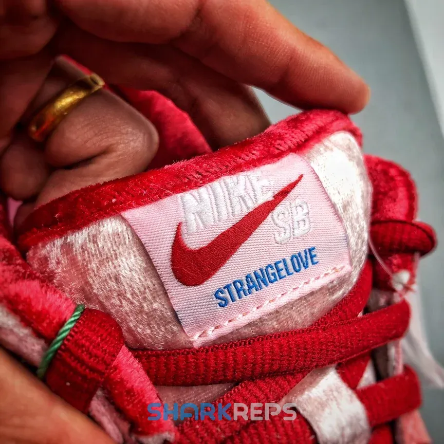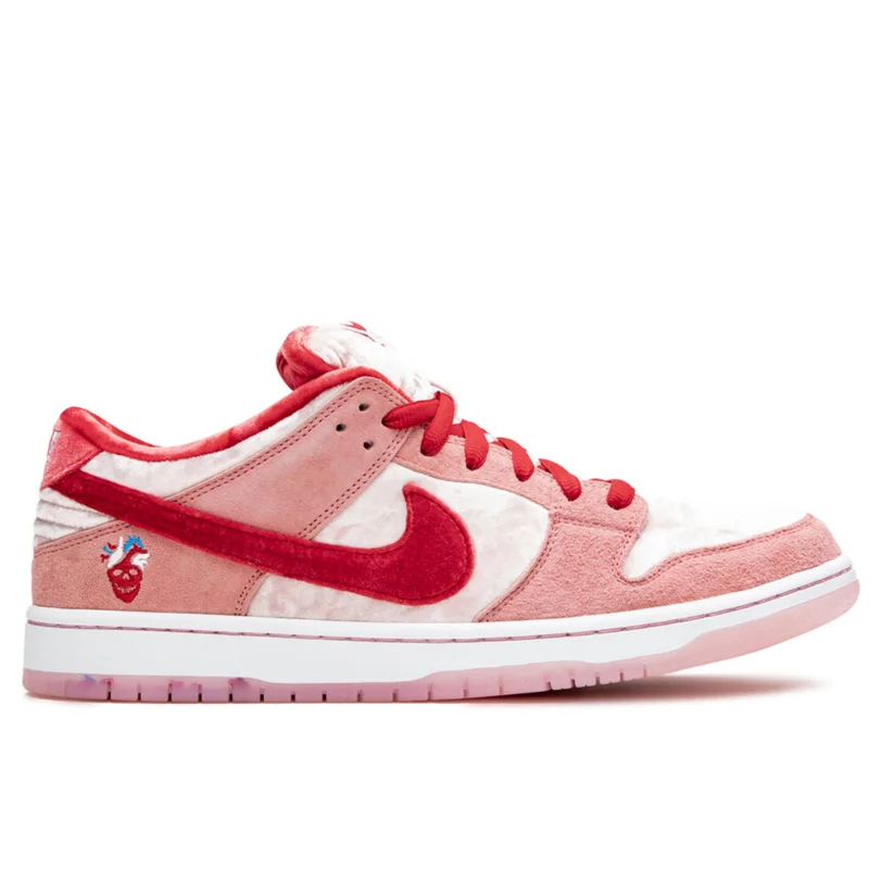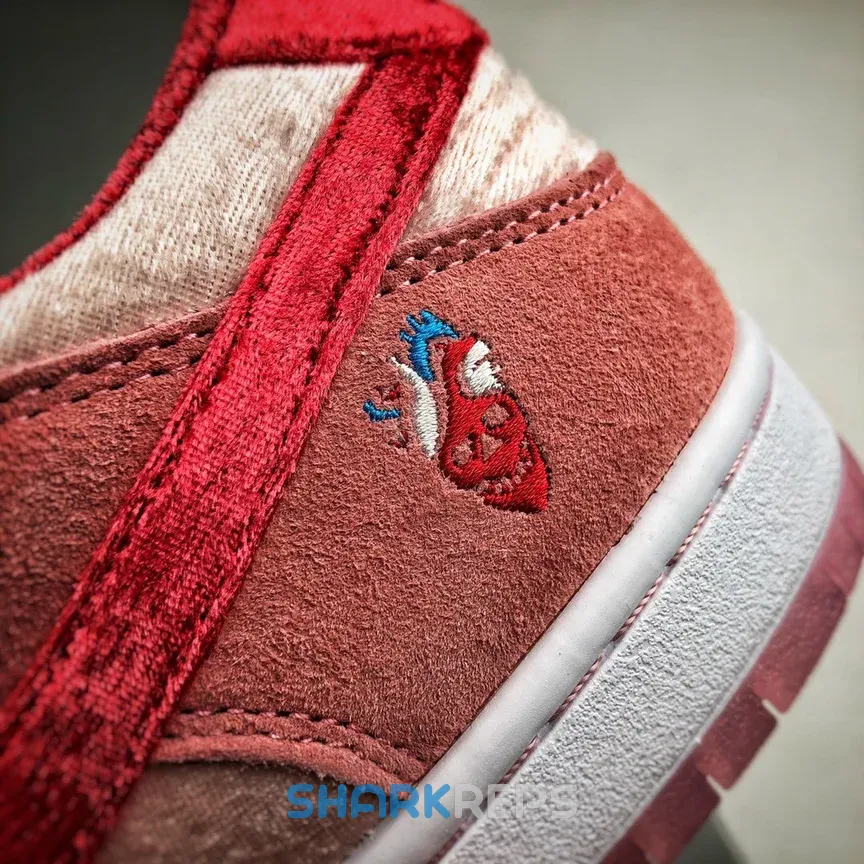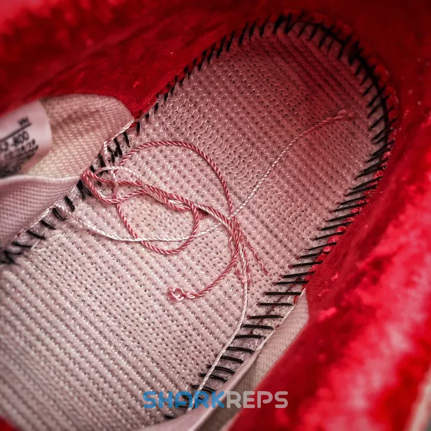 Made in collaboration with Sean Cliver’s skate brand, the StrangeLove x Dunk Low SB QS ‘Valentine’s Day’ celebrates the romantic holiday with a plush take on the retro silhouette. The upper is constructed from white crushed velvet with pink suede overlays and a red velvet Swoosh. Cliver’s ‘Heart Skull’ graphic is embroidered on the lateral heel, while the translucent pink rubber outsole reveals an array of scattered hearts in contrasting red and blue tones.