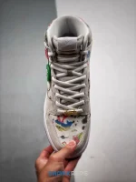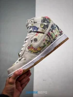 The Supreme x Nike Dunk High SB ‘Rammellzee’ delivers a graphic-intensive take on the classic silhouette. Original artwork from Rammellzee, the late graffiti artist and hip-hop pioneer, decorates the off-white canvas upper, accented with tonal suede construction on the eyestay, Swoosh and forefoot overlay. A Nike SB tag embellishes the padded mesh tongue, while metallic gold lace dubrae spells out ‘SUPREME’ in block lettering. The high-top rides on a traditional cupsole, featuring crisp white sidewalls and a grippy gum rubber outsole.