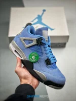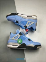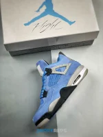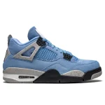 The Air Jordan 4 Retro ‘University Blue’ updates the classic silhouette with a suede upper in a familiar hue inspired by Michael Jordan’s UNC alma mater. The bright blue palette is contrasted by a speckled grey finish on the sneaker’s supportive wings and back heel, featuring a raised Jumpman icon in black. Secondary Jumpman branding adorns the woven tongue tag, designed to mimic a jock tag that typically appears on the bottom hem of Jordan jerseys.