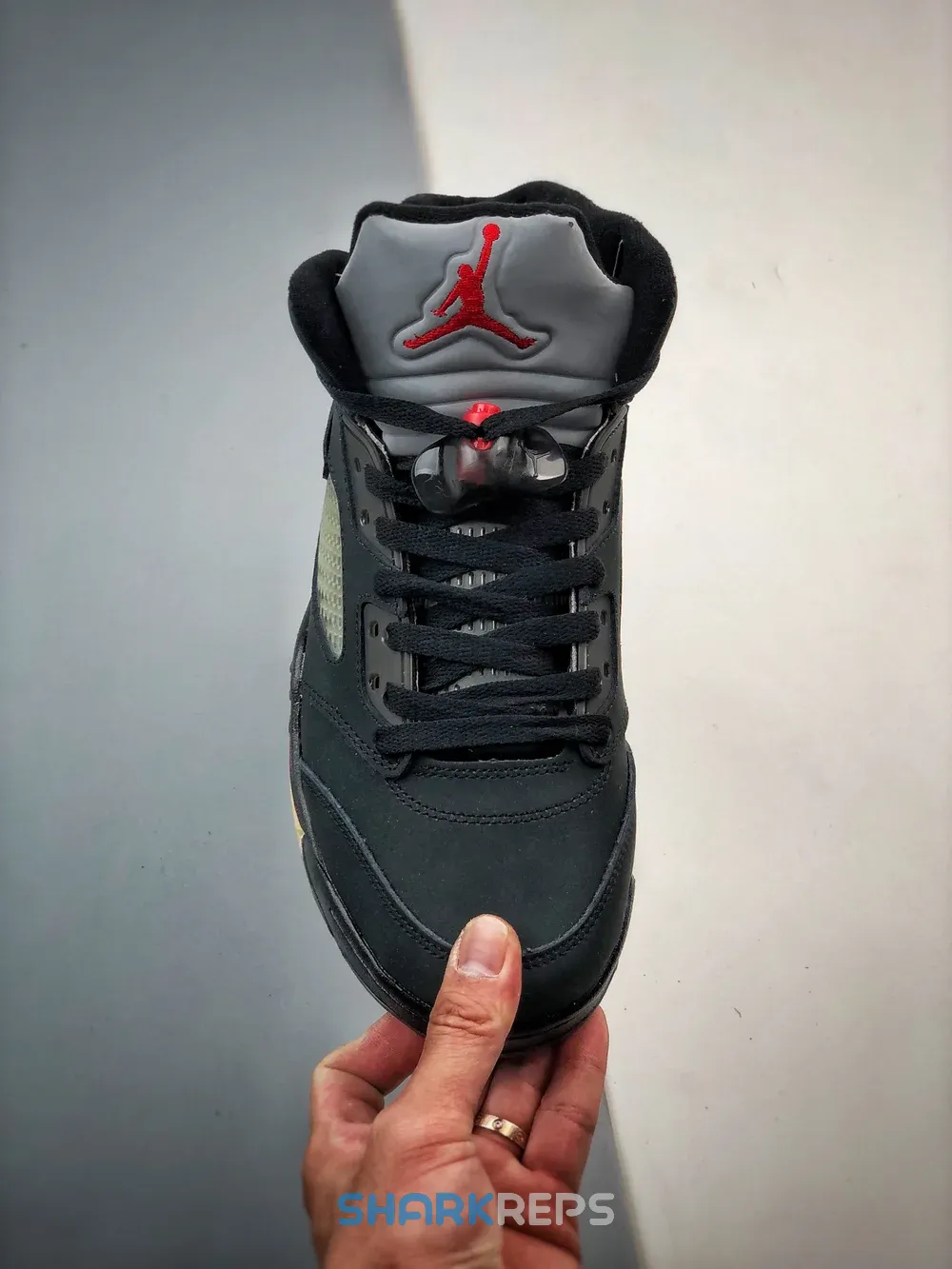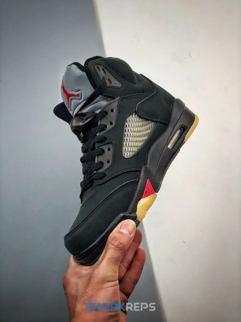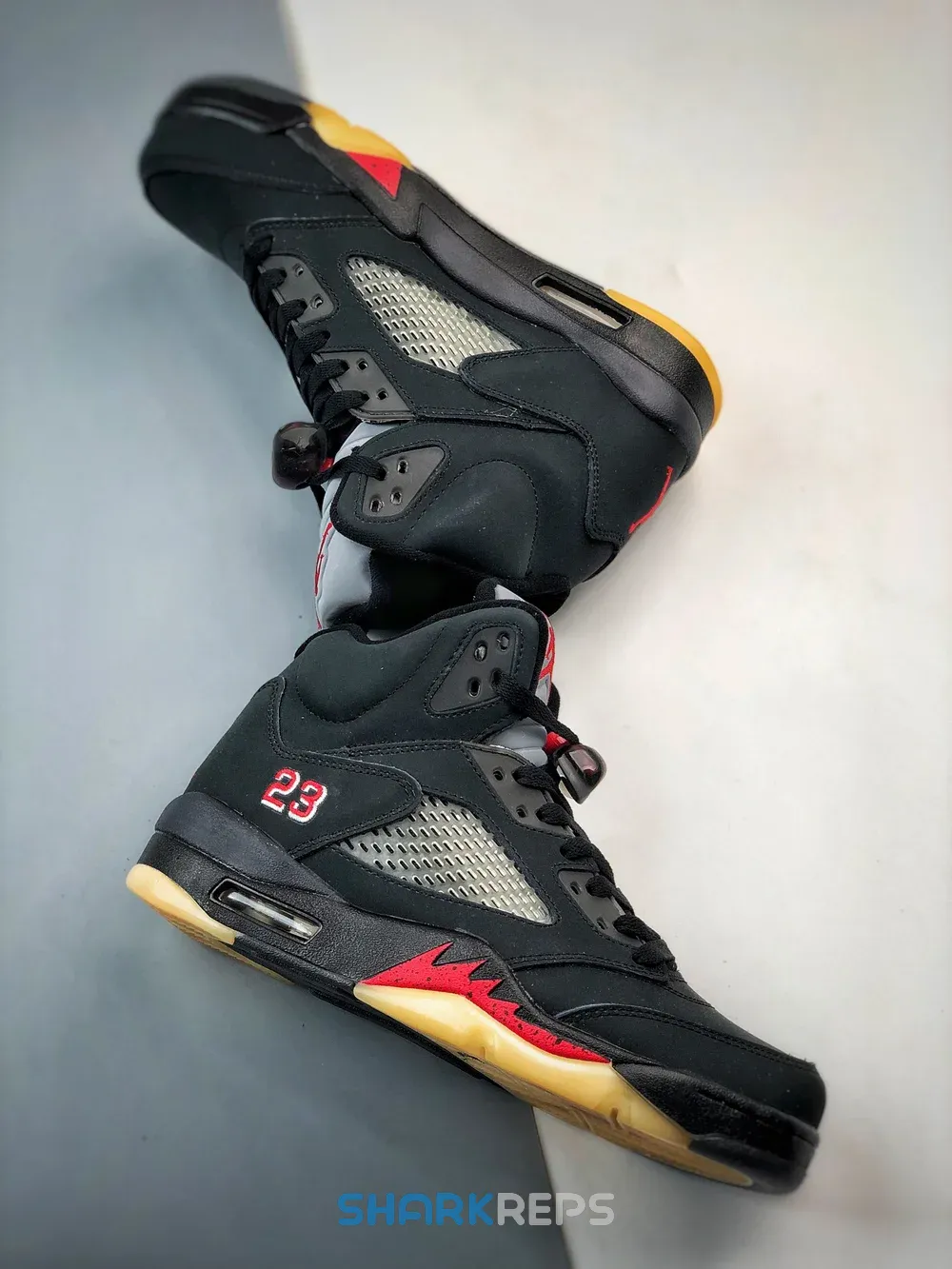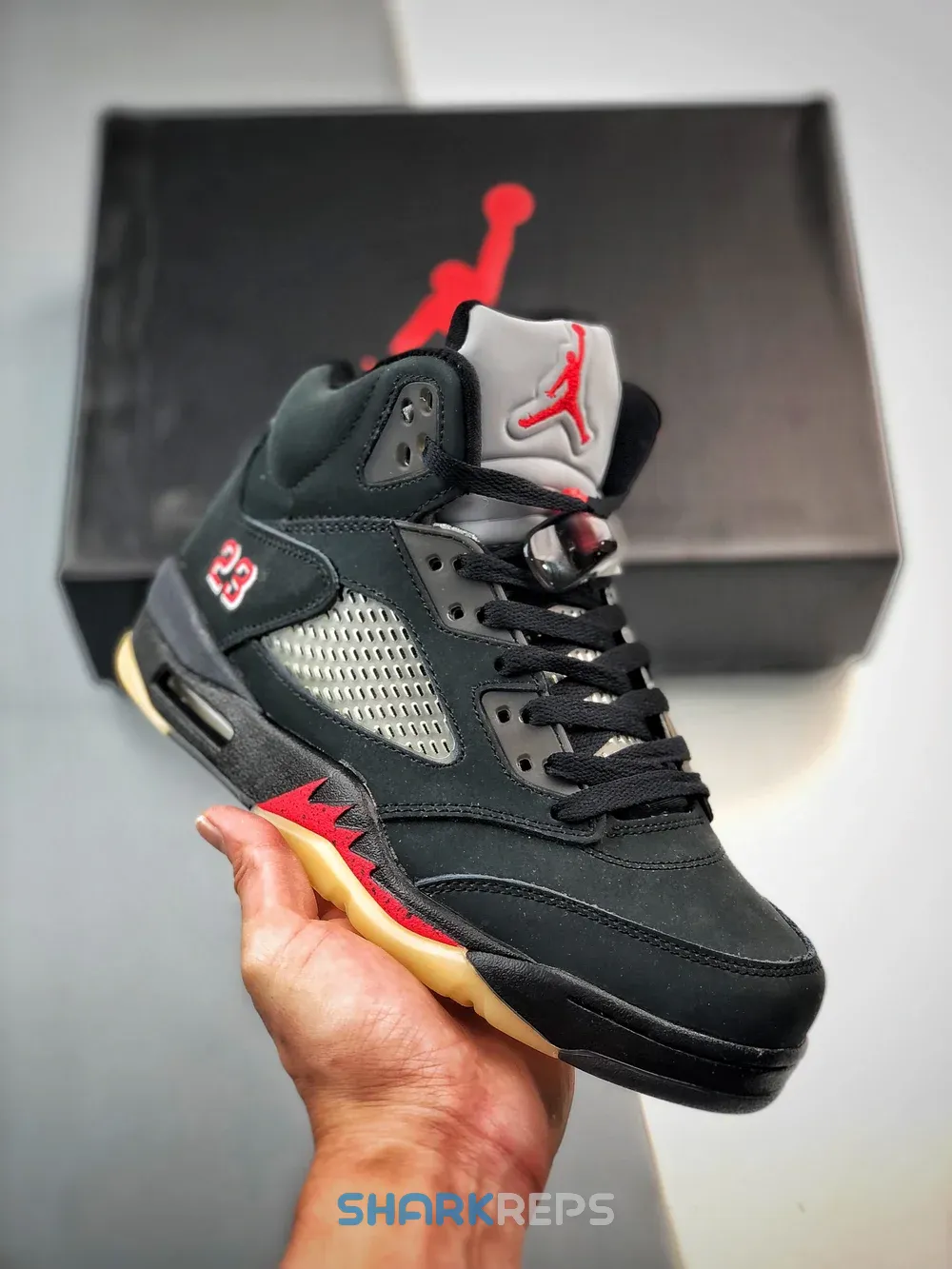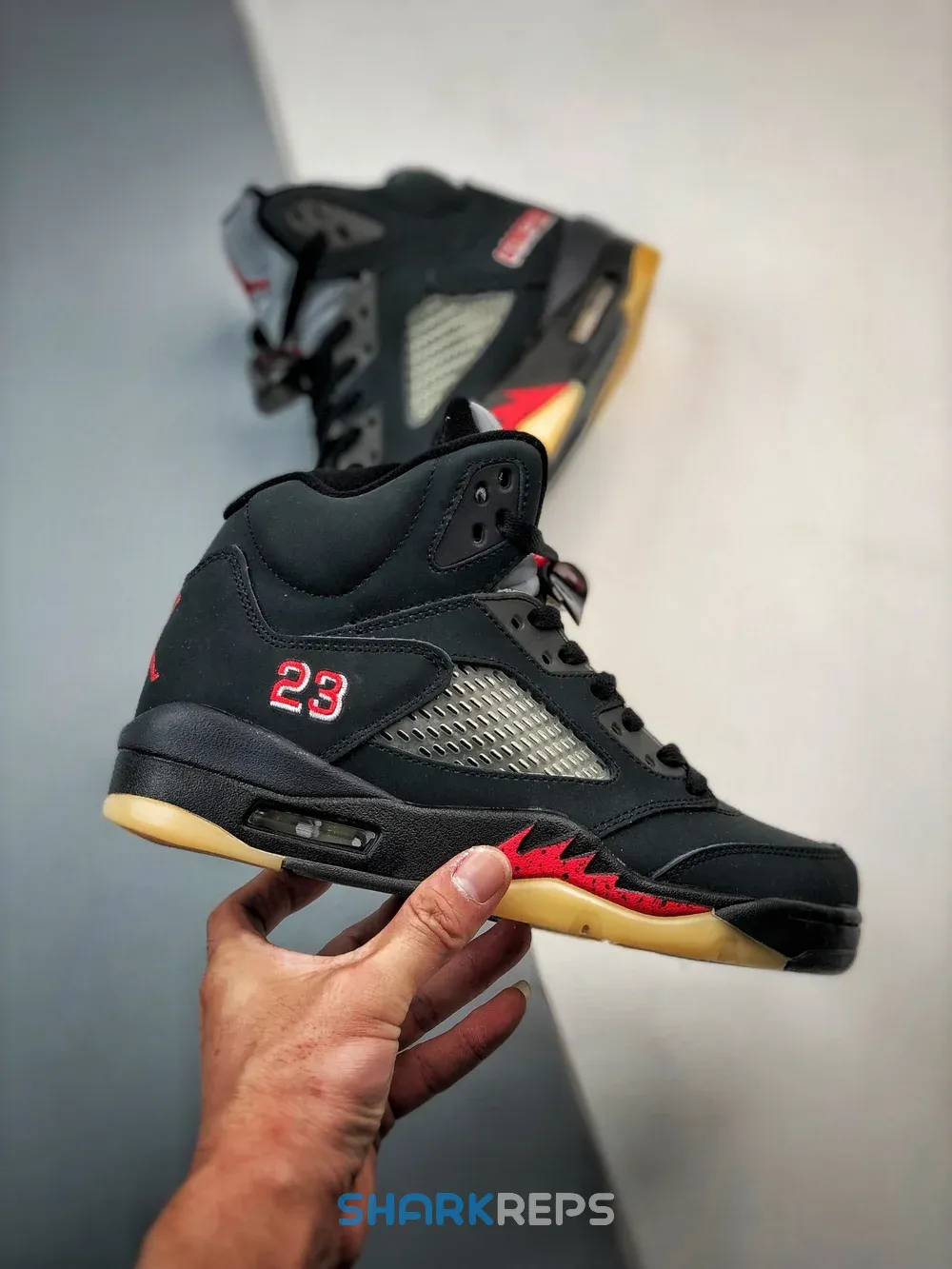 The women’s Air Jordan 5 Retro Gore-Tex ‘Off-Noir’ brings a weather-resistant build to the shoe that Michael Jordan wore during the 1989 – 1990 NBA season. A faded black finish permeates the nubuck upper, equipped with quarter-panel netting and a waterproof Gore-Tex membrane. A crimson Jumpman adorns the heel and silver reflective tongue, while the lateral heel is marked with Gore-Tex branding on the left shoe and a ‘23’ on the right. A black polyurethane midsole features red shark tooth detailing and a visible Air-sole unit in the heel. Underfoot, the translucent rubber outsole is treated to a vintage pre-yellowed finish.