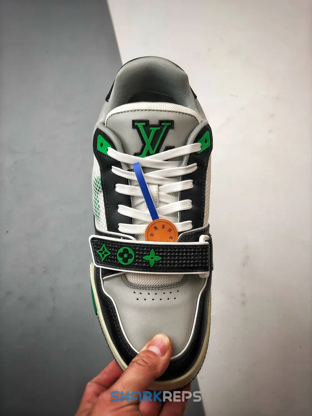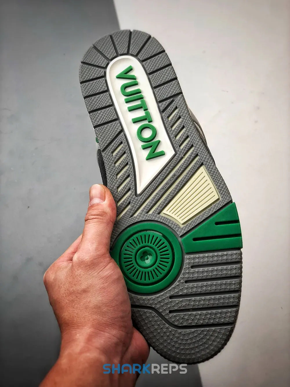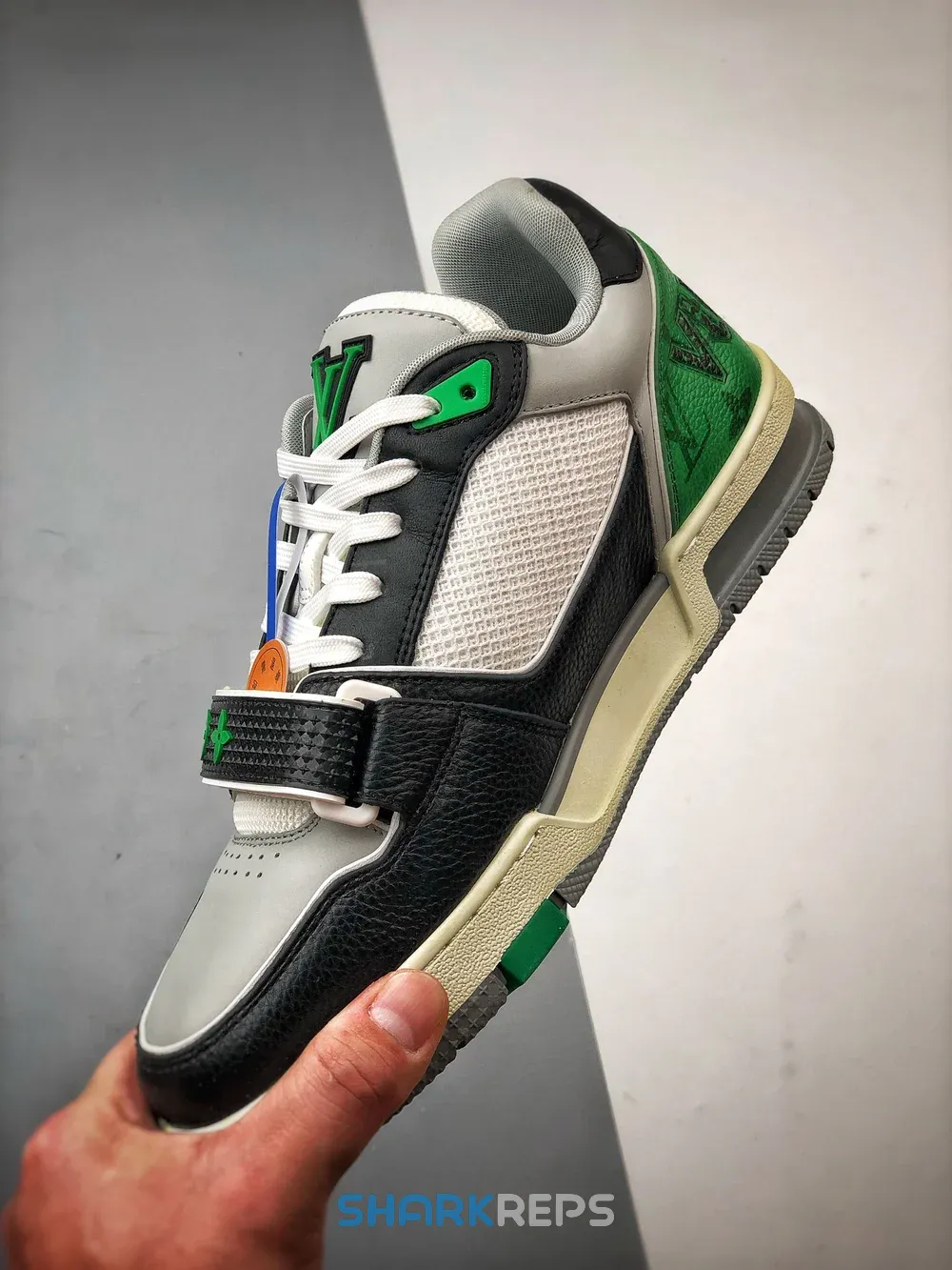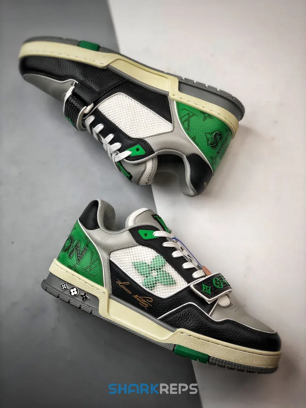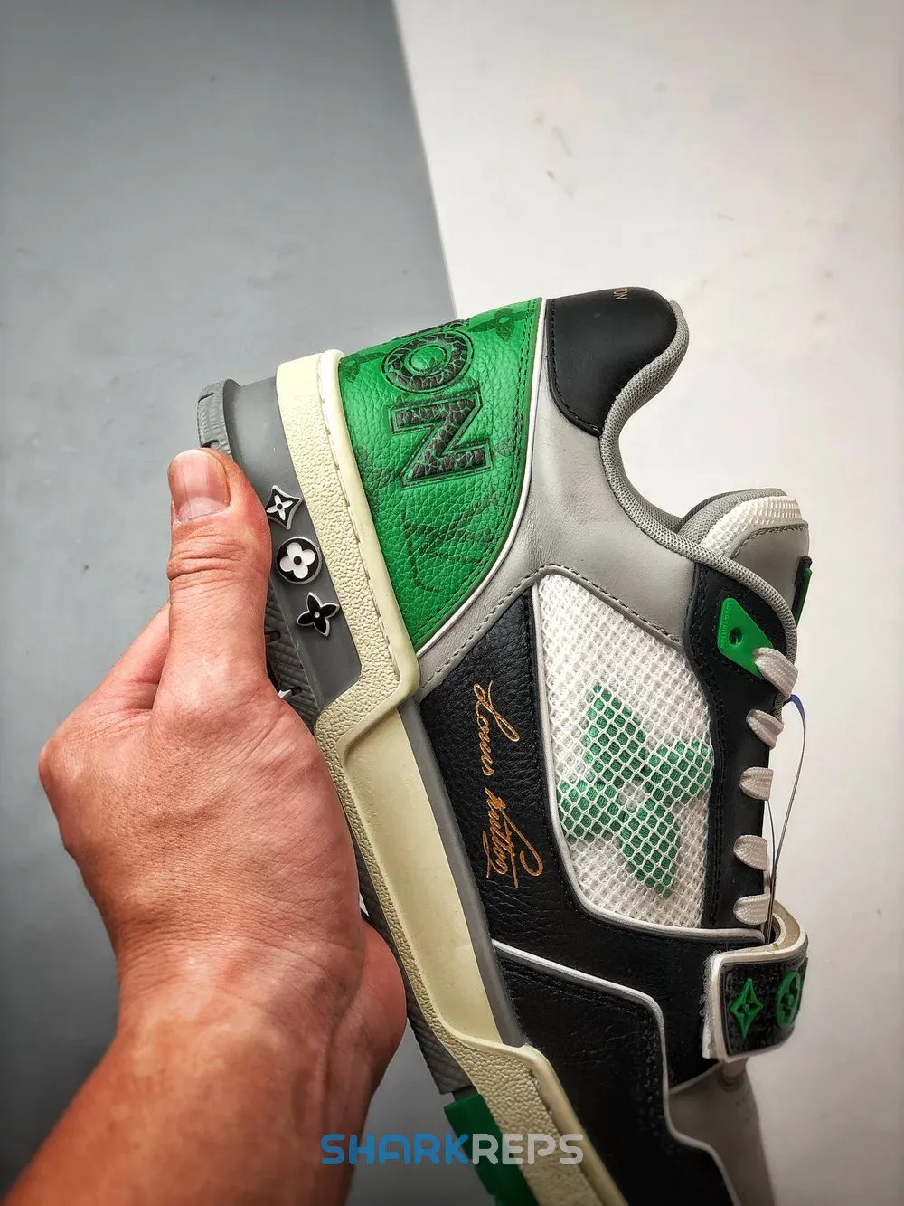 This richly detailed interpretation of the iconic LV Trainer sneaker combines smooth and grained calf leather with Monogram canvas. Inspired by vintage basketball sneakers, this model is notable for its elaborately constructed upper. Among its multiple signatures are a large Monogram Flower on the side and asymmetric Louis and Vuitton signatures on the back.
