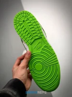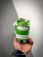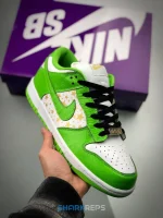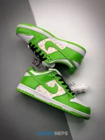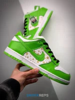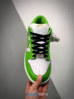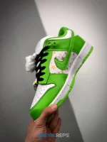 The Supreme x Nike Dunk Low OG SB QS โMean Greenโ represents one of four colorways to release as the spiritual sequel to the partner brandsโ 2003 Dunk High collaboration. Like the original, this pair features a white leather base with printed gold stars and croc-embossed leather overlays, rendered here in a vibrant green hue. A molded Supreme lace jewel in metallic gold is matched by Nike logo hits at the heel tab and woven tongue tag. Lightweight cushioning arrives via a Zoom Air unit in the custom sockliner, featuring a crimson surface marked with dual Supreme and Nike SB branding.