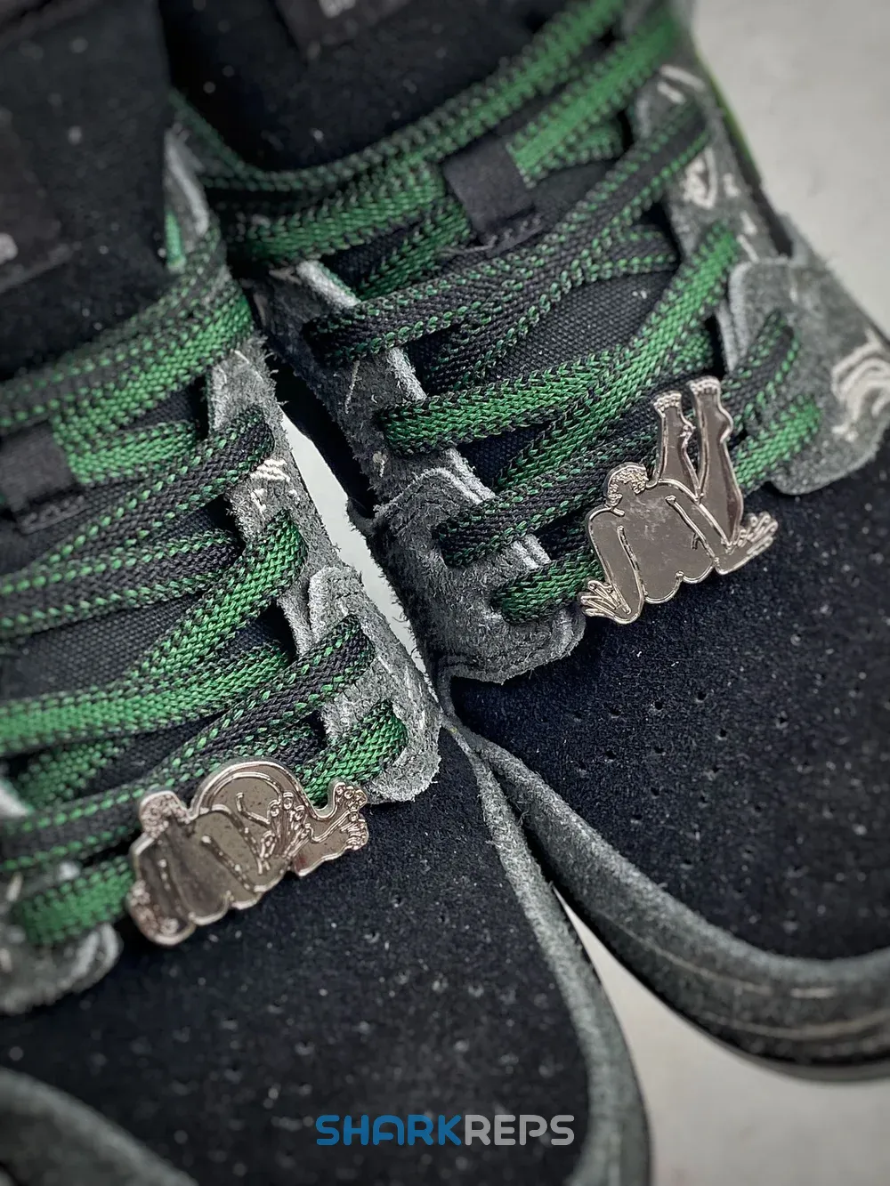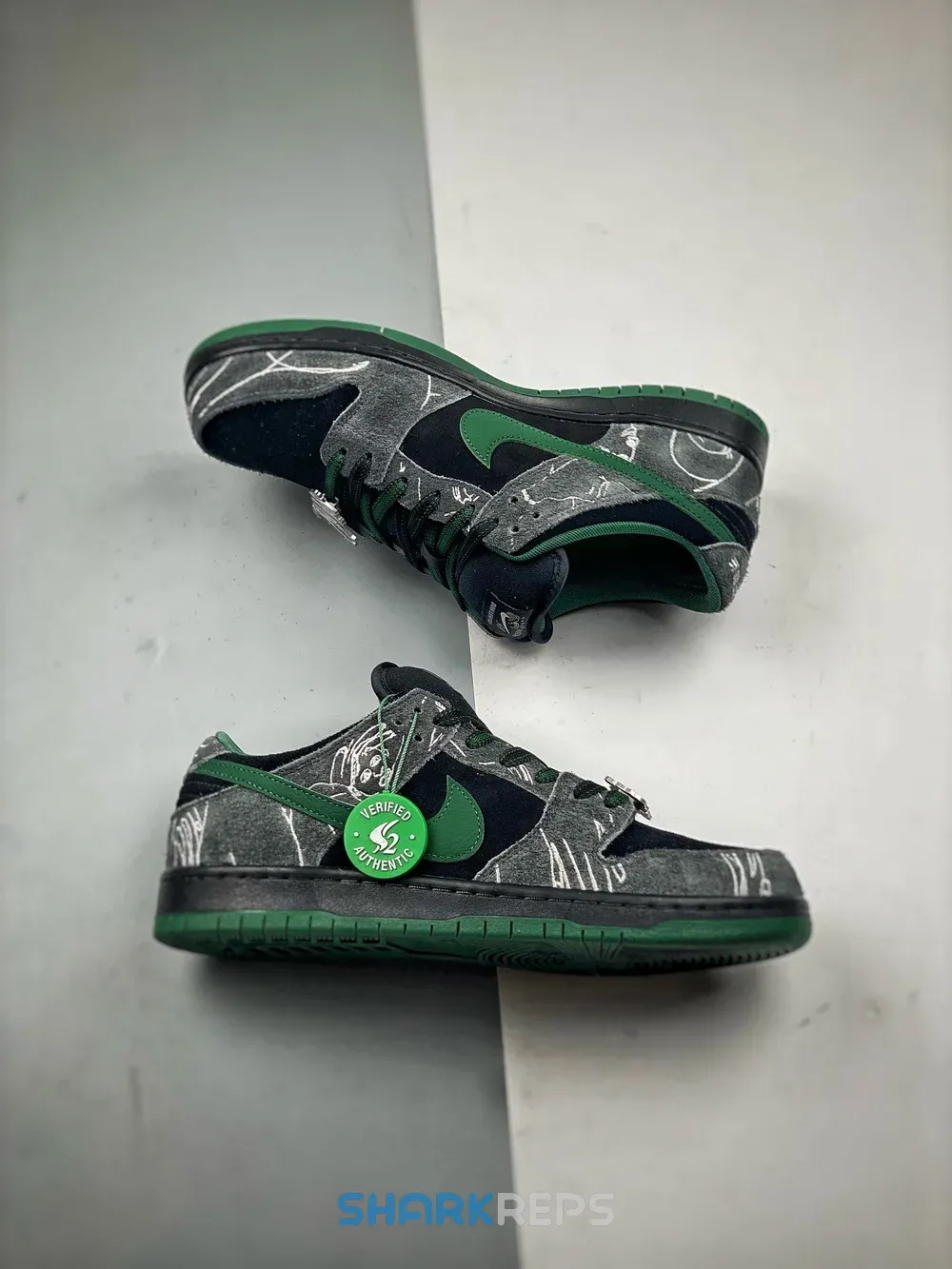 The THERE Skateboards x Nike Dunk Low SB ‘Ultra Humanized’ is crafted from black suede with grey hairy suede overlays covered in original artwork by Jeff Cheung, the co-founder of THERE Skateboards. Contrasting green accents land on the leather Swoosh and textile collar lining. Dual branding decorates each woven tongue tag and back tab, while custom lace jewels shine in a metallic silver finish. The sneaker rests on a solid black midsole, built with stitched sidewall construction and supported by a Gorge Green rubber outsole.