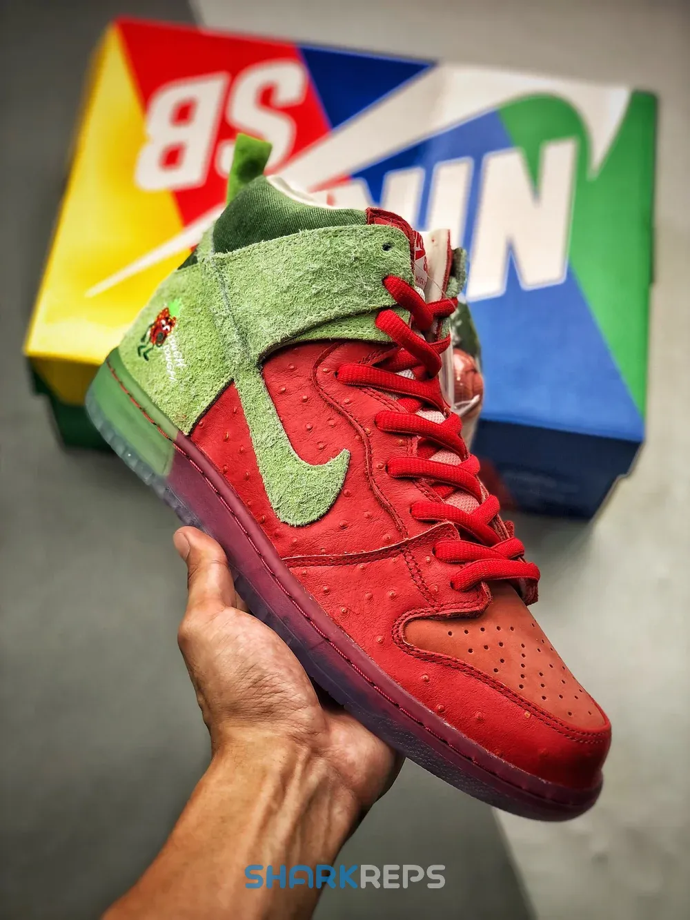 Designed in collaboration with the artist Todd Bratrud, the Nike Dunk High SB ‘Strawberry Cough’ delivers a literal interpretation of the fragrant marijuana strain for which the shoe is named. The two-tone upper, resembling an actual strawberry through a blend of textured red leather and hairy green suede, rides on a semi-translucent rubber cupsole. A coughing anthropomorphic strawberry adorns both the sneaker’s lateral heel and custom sockliner.