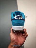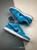 The Nike Dunk Low SB ‘Blue Fury’ showcases a vibrant blue finish on the upper, constructed from nubuck with tonal suede overlays. The sneaker’s signature Swoosh is rendered in royal blue leather, matching an embroidered Nike wordmark on a metallic silver heel tab. A padded mesh tongue combines with Zoom Air cushioning in the sockliner for enhanced comfort. The low-top rests on a resilient white foam midsole, supported underfoot by a translucent rubber outsole.