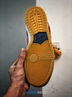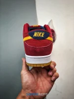 The right shoe of this Nike SB Dunk Low Barcelona features a red suede quarter panel, collar, and heel, with a blue suede toe cap, perforated toe box, eyestays, and heel tab. The right shoe also has a blue mesh tongue. On the left shoe, the placement of blue and red are reversed. However, both feet have a gold swoosh and gold branding on the heel tab and tongue. The midsole is white rubber with Zoom Air cushioning and the outsole is a brown synthetic rubber.