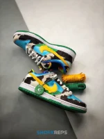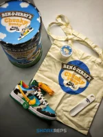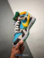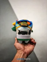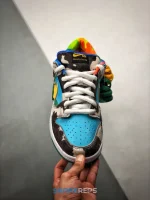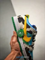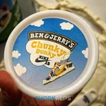 Made in collaboration with Ben & Jerry’s, the Nike Dunk Low SB ‘Chunky Dunky’ replicates the packaging used for the ice cream brand’s Chunky Monkey flavor. The leather upper depicts blue skies and green pastures, while pony-hair overlays are rendered in a spotted cow print. A yellow leather Swoosh is treated to a melting ice cream effect for added visual flair. Atop the tongue, the woven tag features a Chunky Dunky callout alongside Nike SB branding.