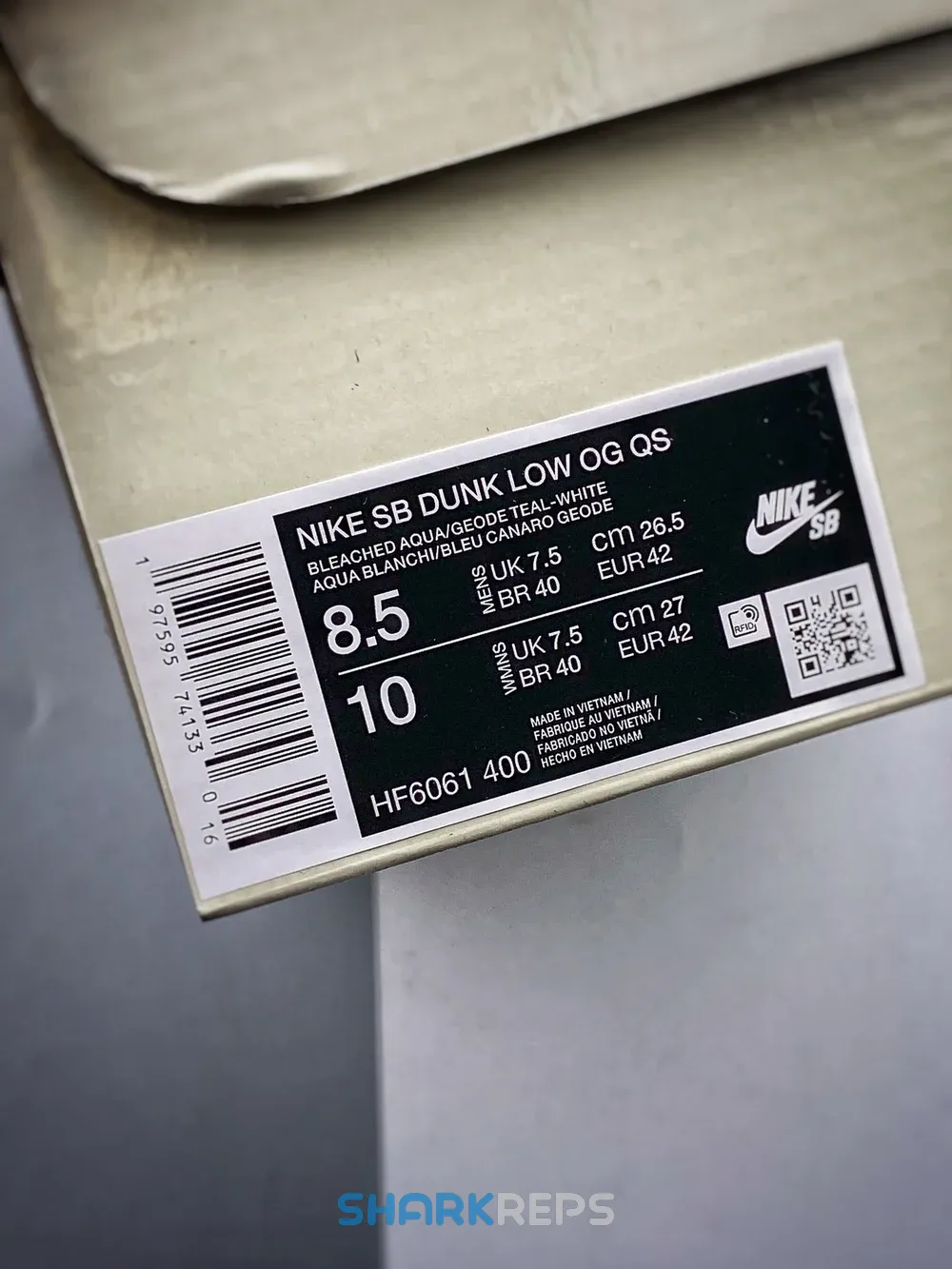 The Futura Laboratories x Nike Dunk Low SB ‘Bleached Aqua’ features a suede Swoosh in a dark teal finish on the white canvas upper, fortified with multicolor canvas overlays covered in Futura’s abstract artwork. The artist’s signature is inscribed on the lateral heel, while the FL logo appears on the medial side. A co-branded woven tag graces the stuffed tongue. Underfoot, a blue-tinged translucent rubber outsole provides grippy traction.