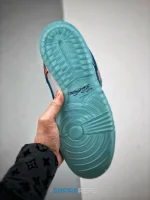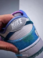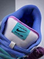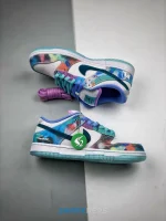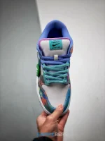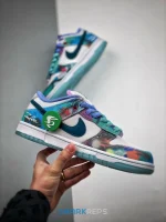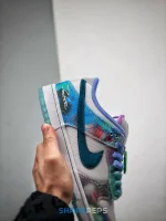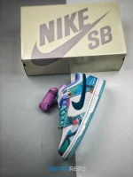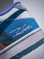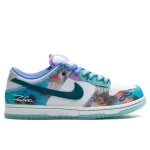 The Futura Laboratories x Nike Dunk Low SB ‘Bleached Aqua’ features a suede Swoosh in a dark teal finish on the white canvas upper, fortified with multicolor canvas overlays covered in Futura’s abstract artwork. The artist’s signature is inscribed on the lateral heel, while the FL logo appears on the medial side. A co-branded woven tag graces the stuffed tongue. Underfoot, a blue-tinged translucent rubber outsole provides grippy traction.