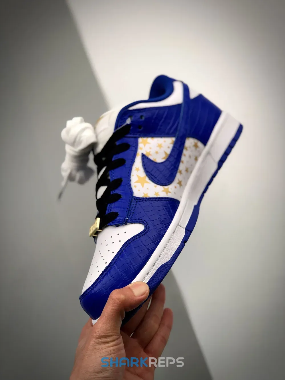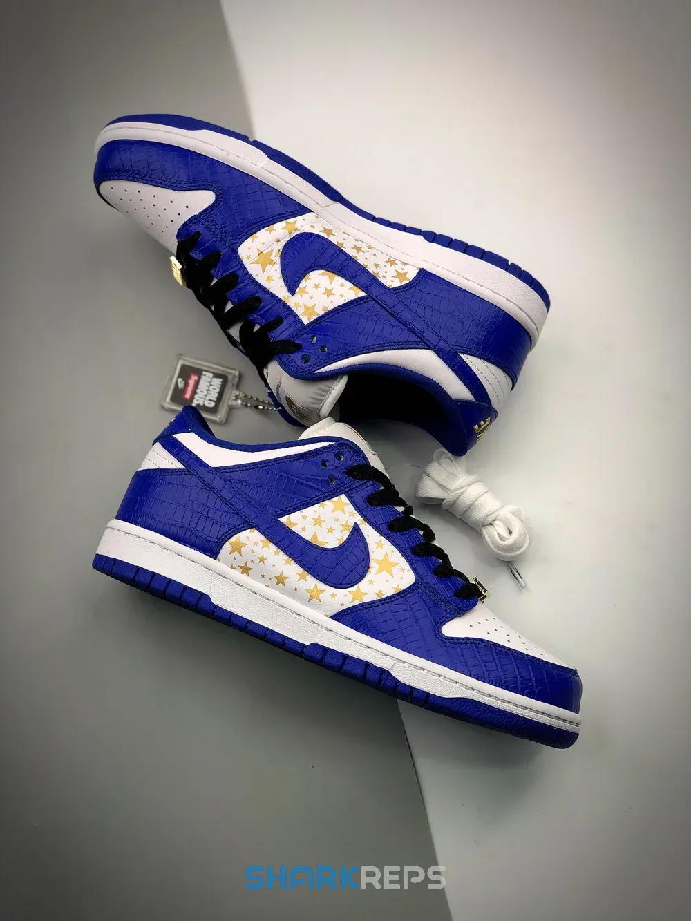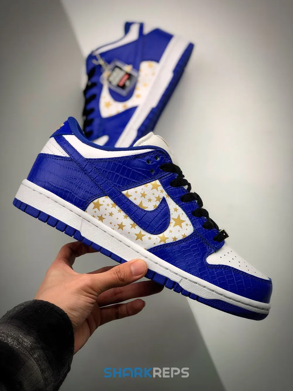 The Supreme x Nike Dunk Low OG SB QS ‘Hyper Royal’ takes direct inspiration from the New York skate brand’s Dunk High collaboration from 2003. Like the high-top, this pair features a white leather base with metallic gold stars on the quarter panels and croc-embossed leather overlays in a contrasting hue. A standard Nike wordmark is embroidered in gold lettering on the heel tab, matching the woven tag atop the stuffed textile tongue. A gold Supreme dubrae shines at the bottom of the lace bed. Lightweight cushioning is provided by a Zoom Air-infused sockliner, its crimson surface embellished with dual Supreme and Nike SB branding.