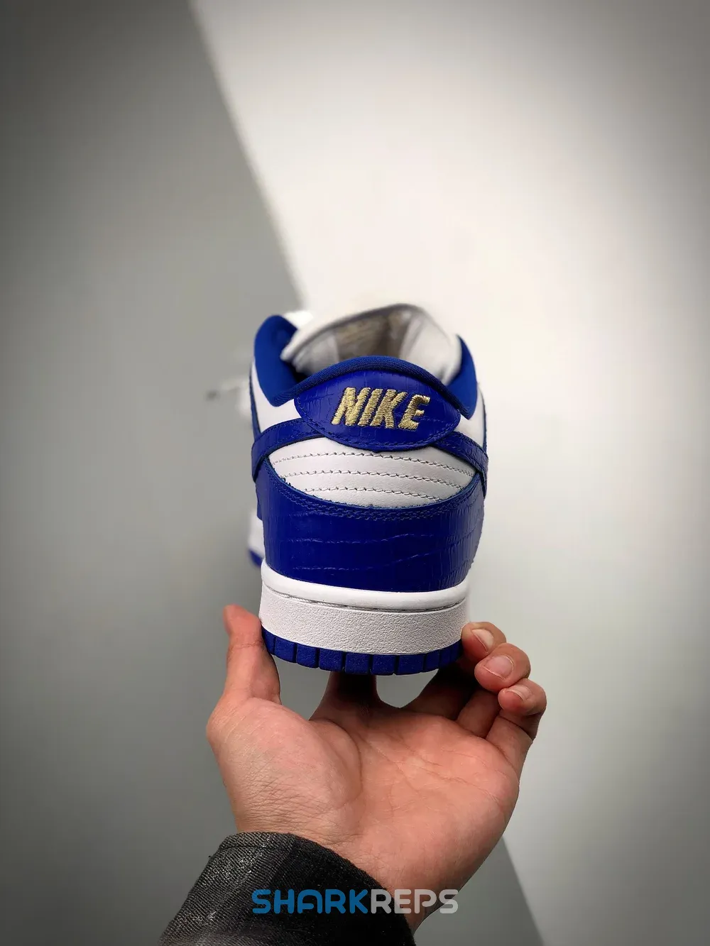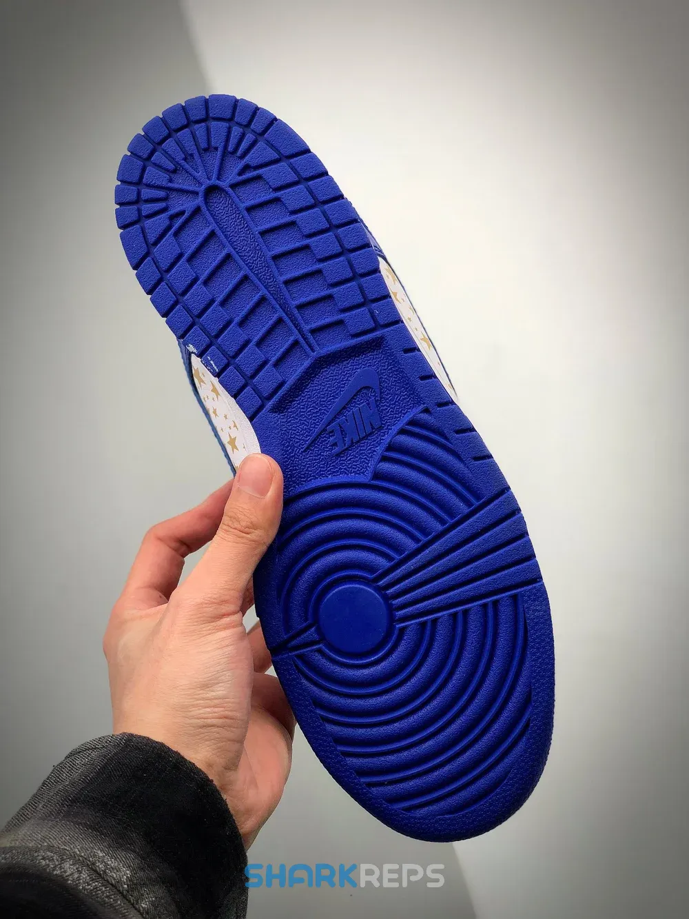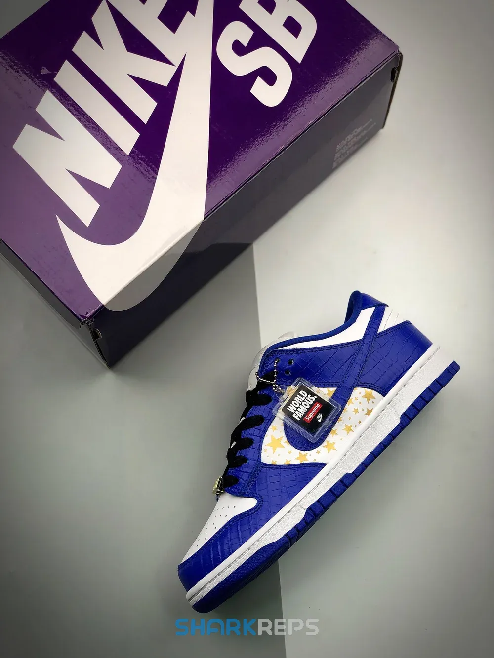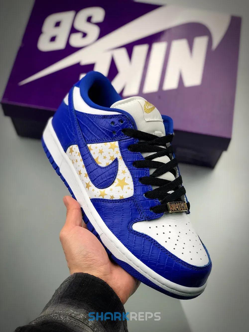 The Supreme x Nike Dunk Low OG SB QS ‘Hyper Royal’ takes direct inspiration from the New York skate brand’s Dunk High collaboration from 2003. Like the high-top, this pair features a white leather base with metallic gold stars on the quarter panels and croc-embossed leather overlays in a contrasting hue. A standard Nike wordmark is embroidered in gold lettering on the heel tab, matching the woven tag atop the stuffed textile tongue. A gold Supreme dubrae shines at the bottom of the lace bed. Lightweight cushioning is provided by a Zoom Air-infused sockliner, its crimson surface embellished with dual Supreme and Nike SB branding.