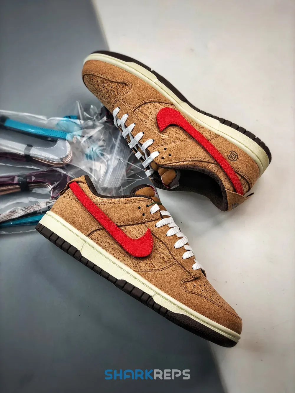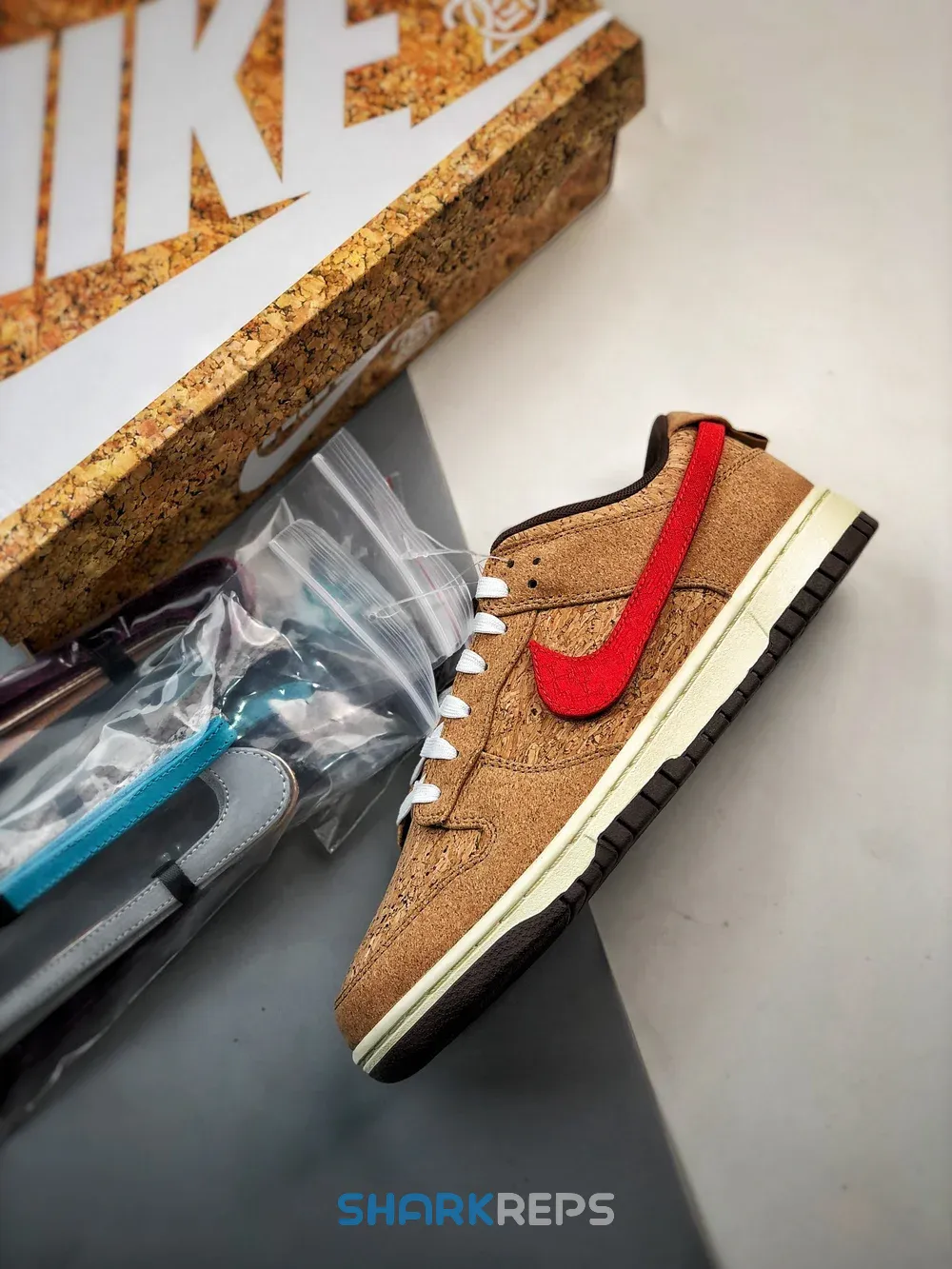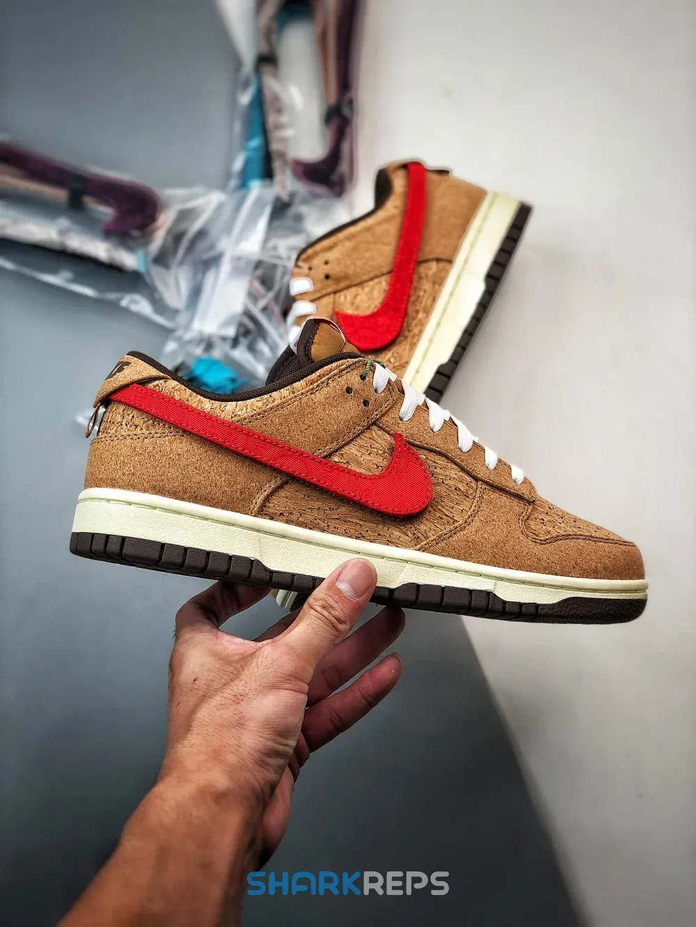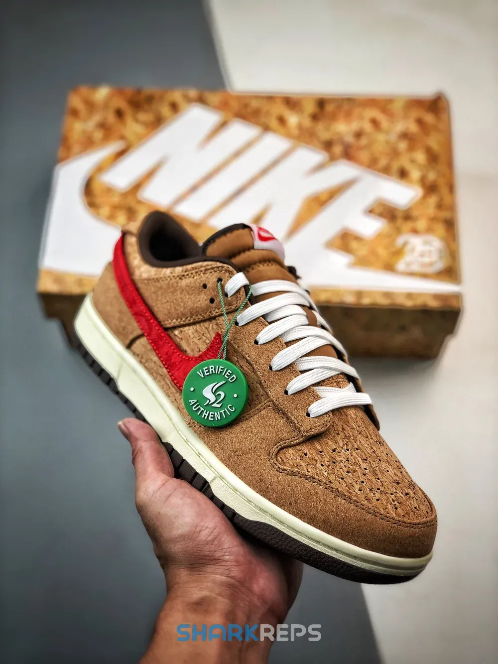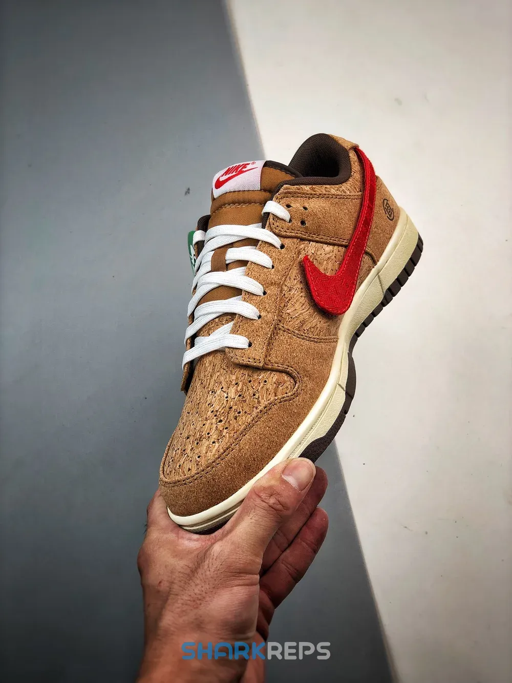 The CLOT x Nike Dunk Low SP ‘Cork’ celebrates the 20th anniversary of the Hong Kong streetwear brand founded by Edison Chen and Kevin Poon. The low-top features a distinctive cork upper — inspired by Chen’s early days of using cork boards to gather his creative ideas — with three lace-color options and six detachable Swooshes. A woven Nike tag decorates the nylon tongue, while the CLOT logo is stamped on the medial heel. Back tabs flip up to reveal ‘2003’ on the left shoe and ‘2023’ on the right, with both figures expressed in Arabic numerals and Chinese characters. Underpinning the sneaker is a sturdy cupsole that pairs vintage off-white sidewalls with a dark brown rubber outsole.