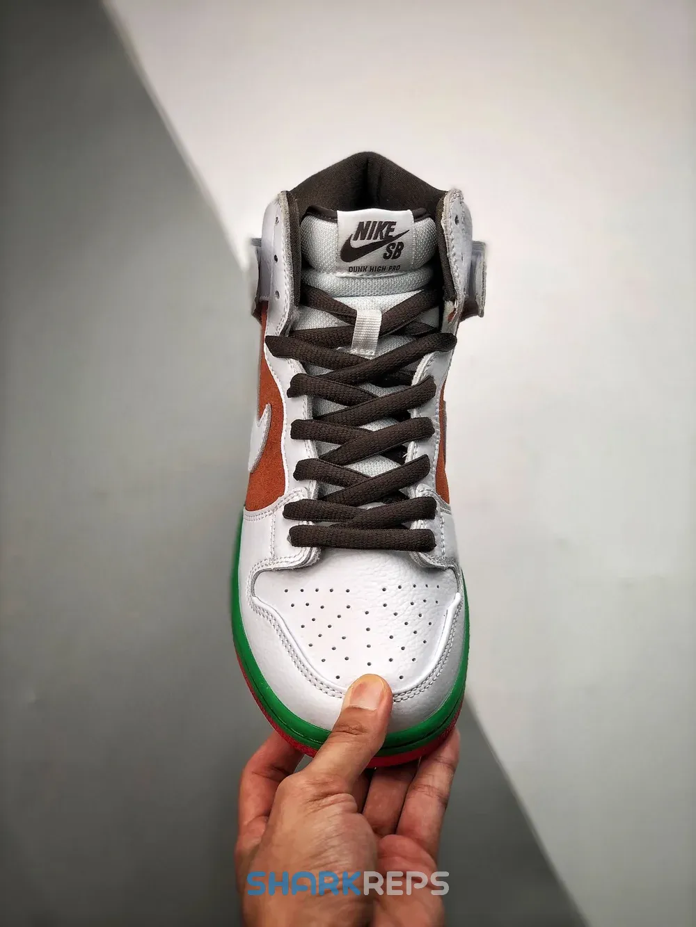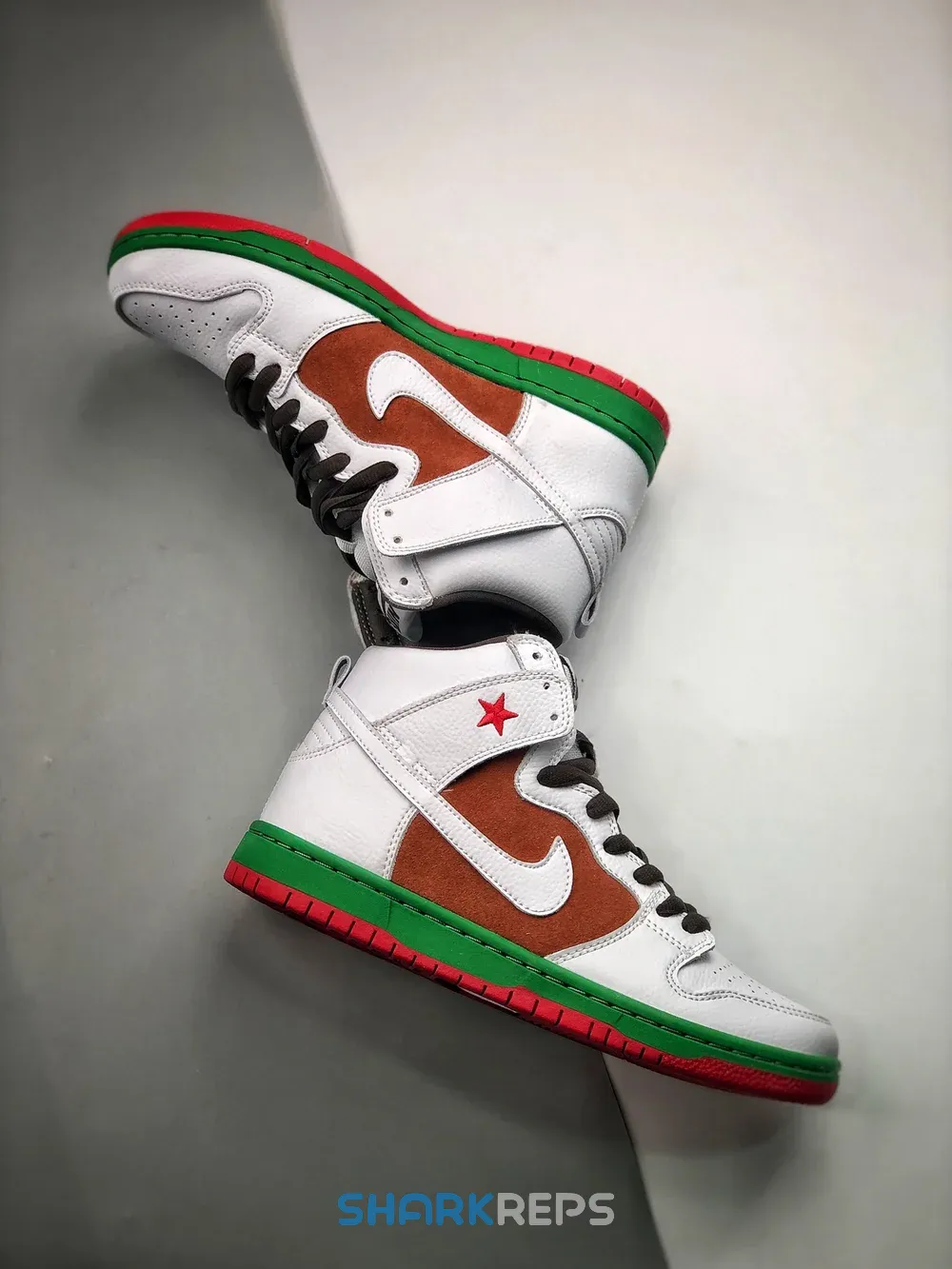 The Nike Dunk High SB ‘Cali’ is a high-top re-release of the 2004 Nike SB Dunk Low ‘Cali’ colorway. Inspired by the colors of the California state flag, the August 2014 release features a white leather upper with Pecan Brown on the quarter panel, a green midsole, red outsole, and stitched red star at the lateral side.