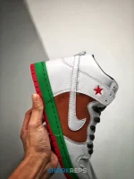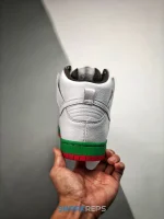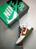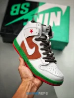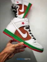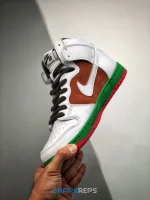 The Nike Dunk High SB ‘Cali’ is a high-top re-release of the 2004 Nike SB Dunk Low ‘Cali’ colorway. Inspired by the colors of the California state flag, the August 2014 release features a white leather upper with Pecan Brown on the quarter panel, a green midsole, red outsole, and stitched red star at the lateral side.