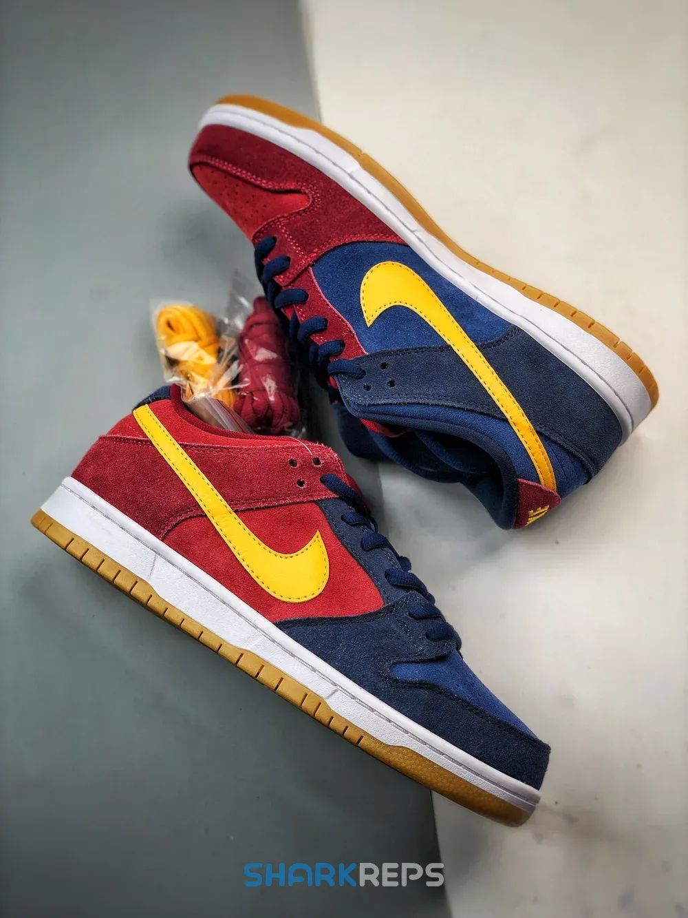 The right shoe of this Nike SB Dunk Low Barcelona features a red suede quarter panel, collar, and heel, with a blue suede toe cap, perforated toe box, eyestays, and heel tab. The right shoe also has a blue mesh tongue. On the left shoe, the placement of blue and red are reversed. However, both feet have a gold swoosh and gold branding on the heel tab and tongue. The midsole is white rubber with Zoom Air cushioning and the outsole is a brown synthetic rubber.