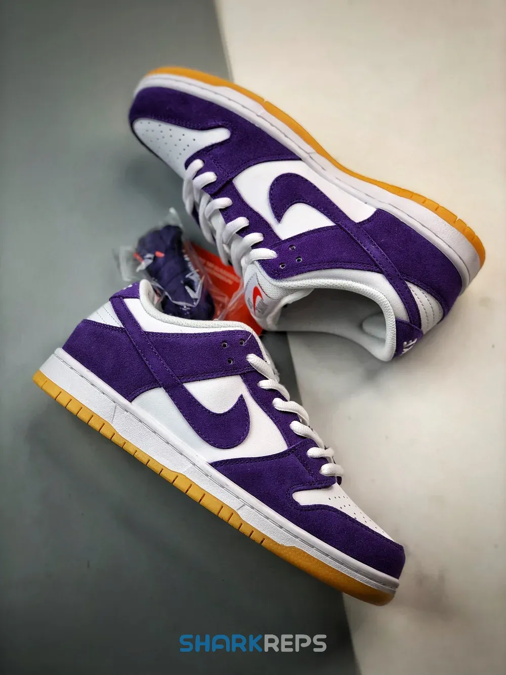 The Nike SB Dunk Low Pro ISO Orange Label Court Purple retains the iconic Dunk Low silhouette, characterized by its low-top design in a color scheme that pays homage to the Los Angeles Lakers, with the incorporation of Court Purple overlays and a subtly toned sole.