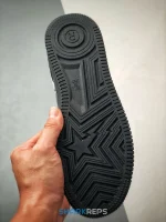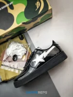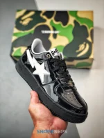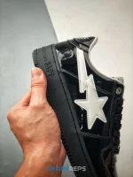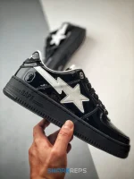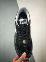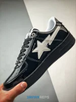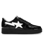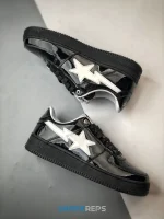 The A Bathing Ape Bape Sta #2 Black Patent is a low top black patent sneaker from the BAPE STA #2 line produced by the Japanese streetwear brand, A Bathing Ape. The BAPE STA line boasts bold and vibrant designs, and this colorway is no exception. This is a #2 presenting in a shiny black and white patent leather colorway. The main focal point of the shoe is the white shooting star on both side panels made from smooth leather. You’ll notice a perforated toebox to keep feet cool, as well as a black midsole that will not show scuffs and scrapes. Various branding is seen throughout the shoe, from the embossed heel logo in white to the white and black patch sewn on the tongue.