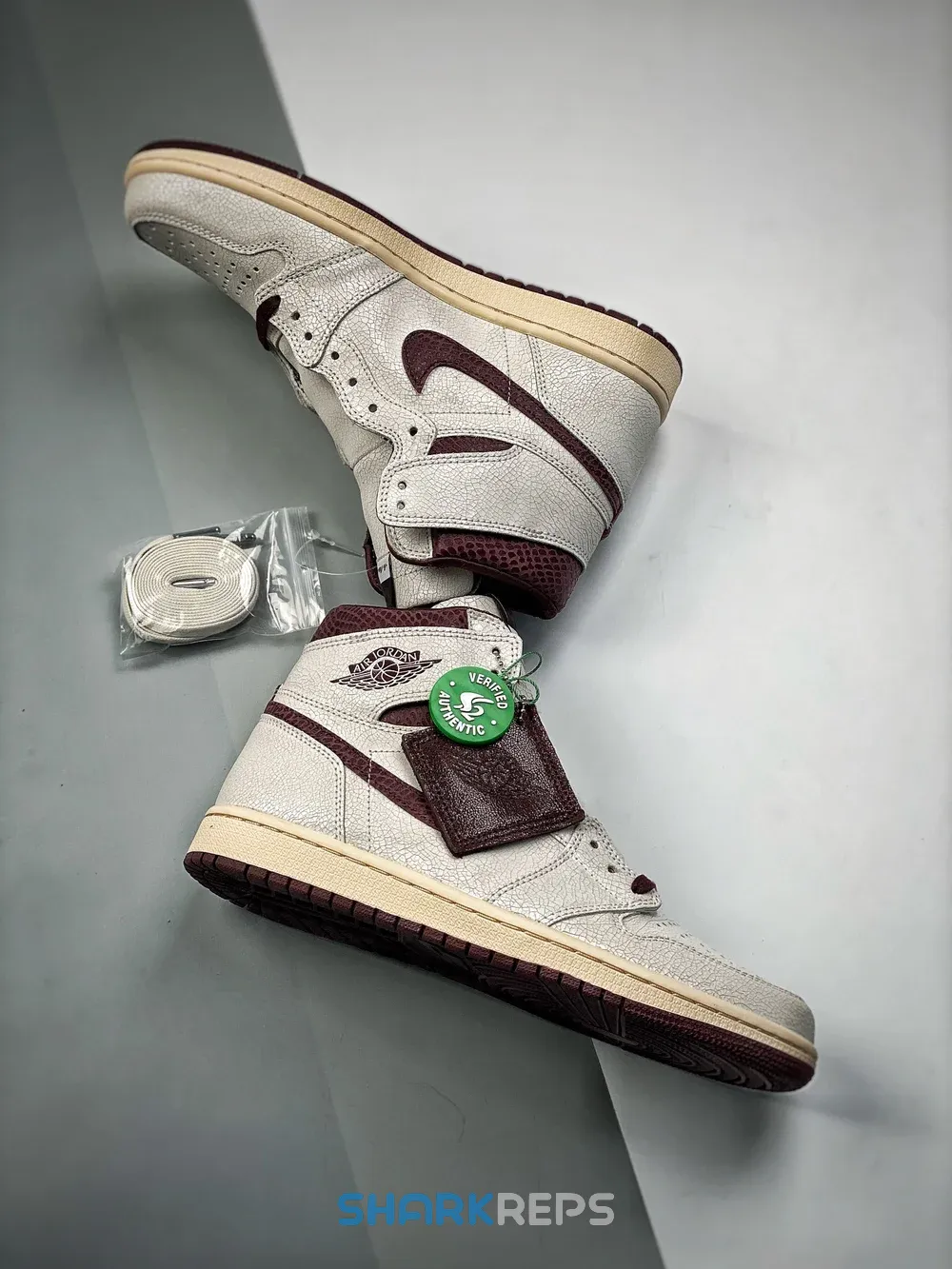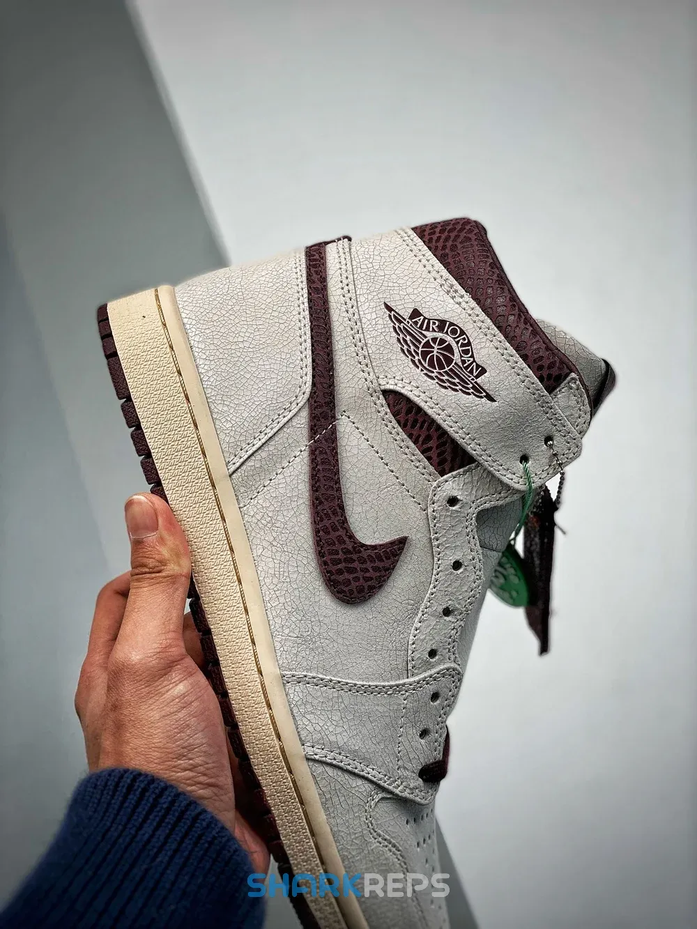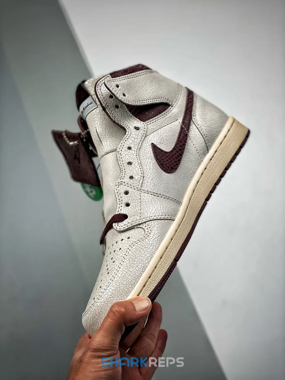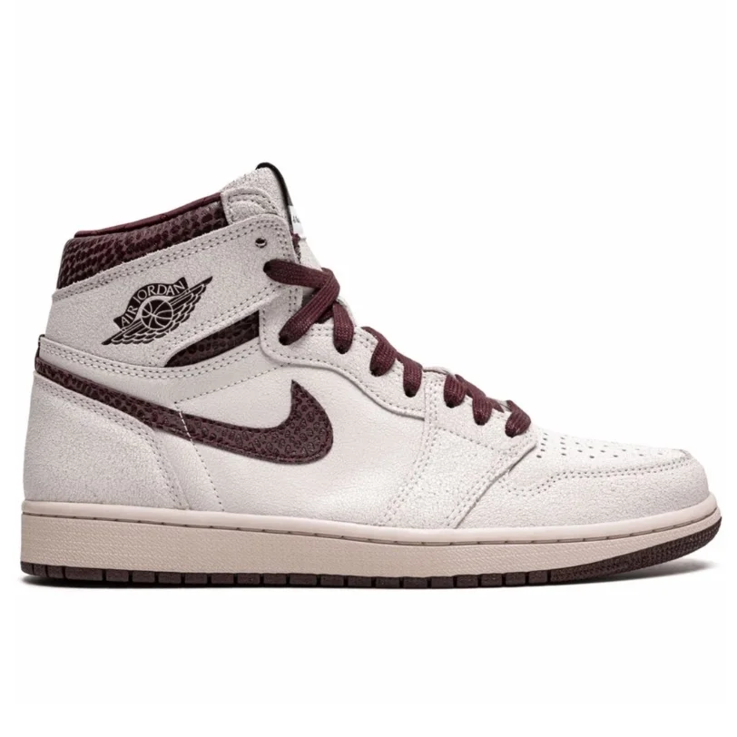 The Air Jordan 1 A Ma Maniére features a premium cracked leather upper with burgundy reptilian-textural leather collars and Swooshes. Silky quilted lining and custom woven tongue and insole labels add a sense of luxury. At the base, a yellowed sole provides a vintage feel to complete the design.