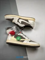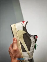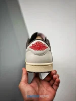 The Travis Scott x Air Jordan 1 Retro Low OG ‘Reverse Mocha’ delivers a twist on the original ‘Mocha’ AJ1 Low from 2019. The upper combines a brown suede base with ivory leather overlays and the Houston rapper’s signature reverse Swoosh on the lateral side, featuring oversized dimensions and a neutral cream finish. Contrasting scarlet accents distinguish a pair of woven Nike Air tongue tags, as well as mismatched Cactus Jack and retro Wings logos embroidered on each heel tab. A vintage off-white rubber midsole is bolstered with encapsulated Nike Air cushioning in the heel and a brown rubber outsole underfoot.