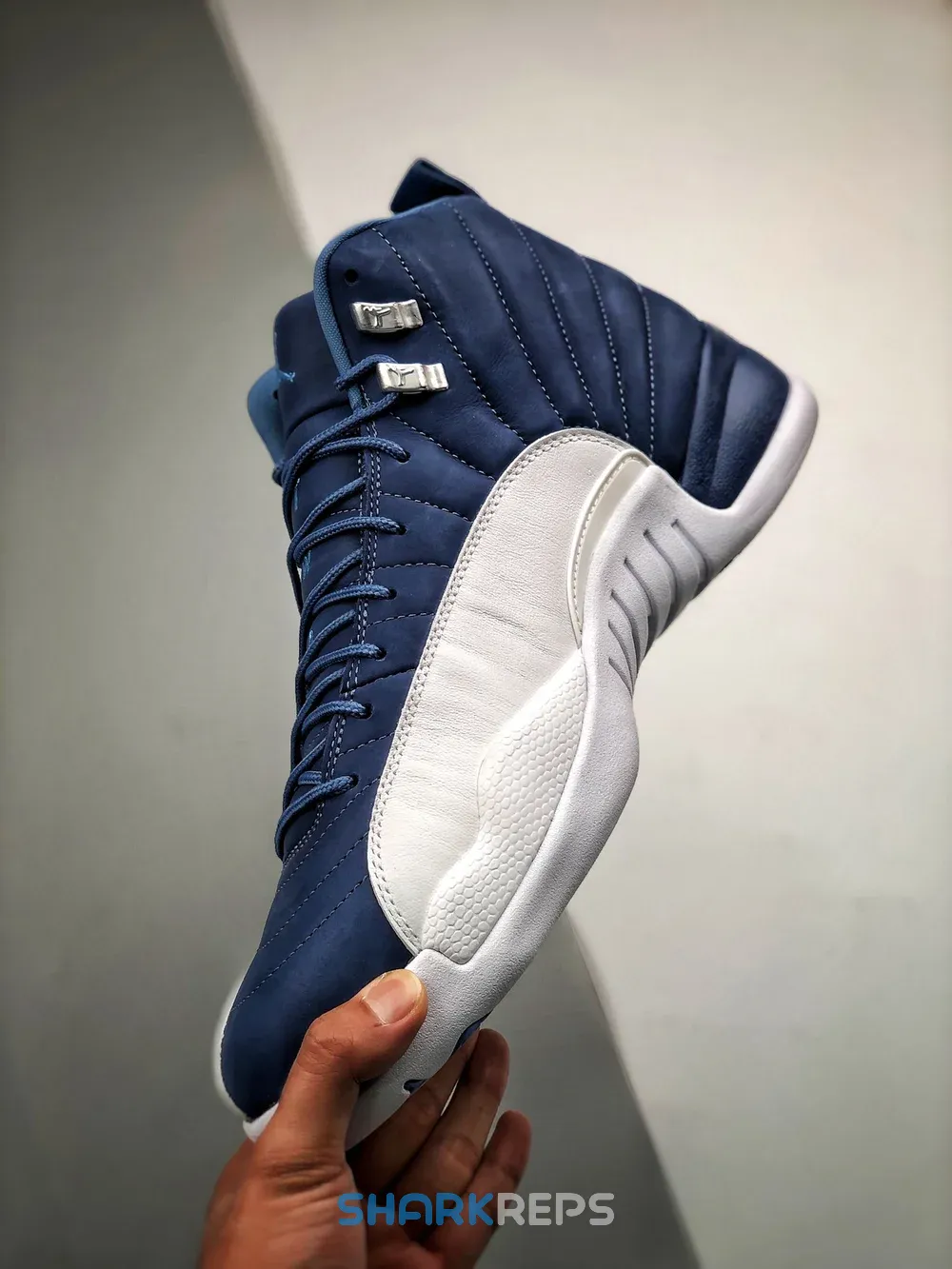 The Air Jordan 12 Retro ‘Indigo’ delivers a simple two-tone colorway of the classic silhouette. The upper makes use of stitched leather in a straightforward indigo hue, accented with a smooth leather mudguard in white. A lighter shade of Legend Blue appears on the heel tab and embroidered Jumpman atop the tongue. The silhouette’s subtle lizard texture is limited to the midsole, reinforced by a herringbone rubber outsole and a carbon fiber shank.