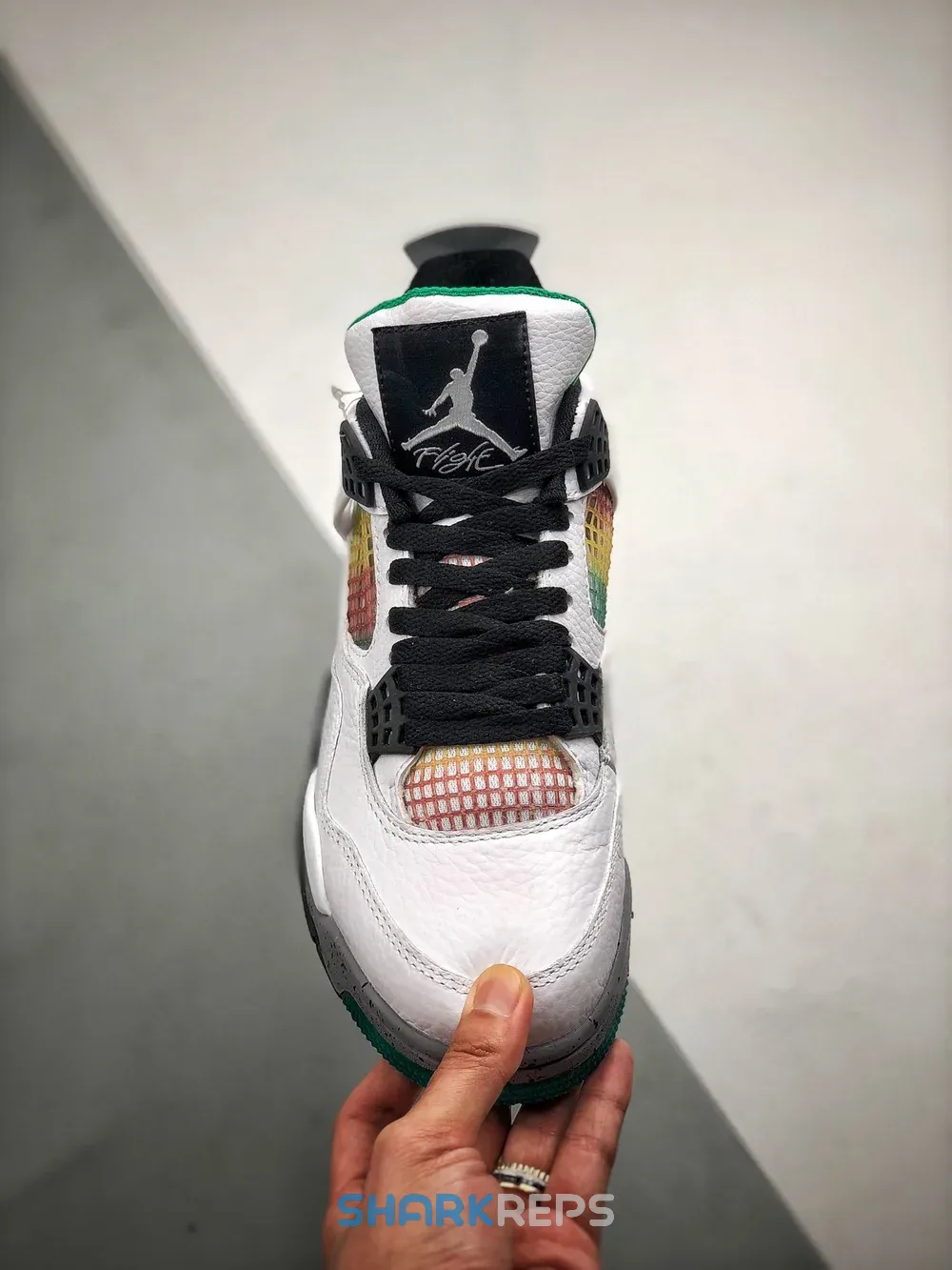 The women’s Air Jordan 4 Retro ‘Rasta’ showcases a gradient blend of red, yellow and green hues on the netting that covers the quarter panel and throat. The rest of the upper is constructed from white tumbled leather, contrasted by black hits on the eyelets, laces and woven tongue tag. A speckled grey finish is applied to the midsole and heel panel, the latter embellished with a Jumpman logo hit. A two-tone green and black outsole provides durable traction underfoot.