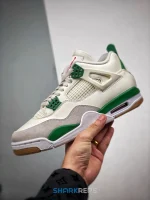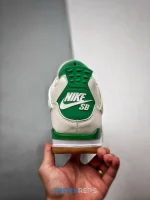 The Nike SB x Air Jordan 4 Retro SP ‘Pine Green’ presents a skate-ready version of the legacy silhouette. Crafted from smooth off-white leather, the upper is reinforced with a forefoot overlay in light grey suede. Contrasting green accents land on the molded eyelets and heel tab, the latter marked with embossed Nike SB branding. A crimson Jumpman on the Flight tongue tag provides an unexpected pop of color. The sneaker rides on a two-tone foam midsole, fitted with an exposed Air-sole unit in the heel and supported by a gum rubber outsole.